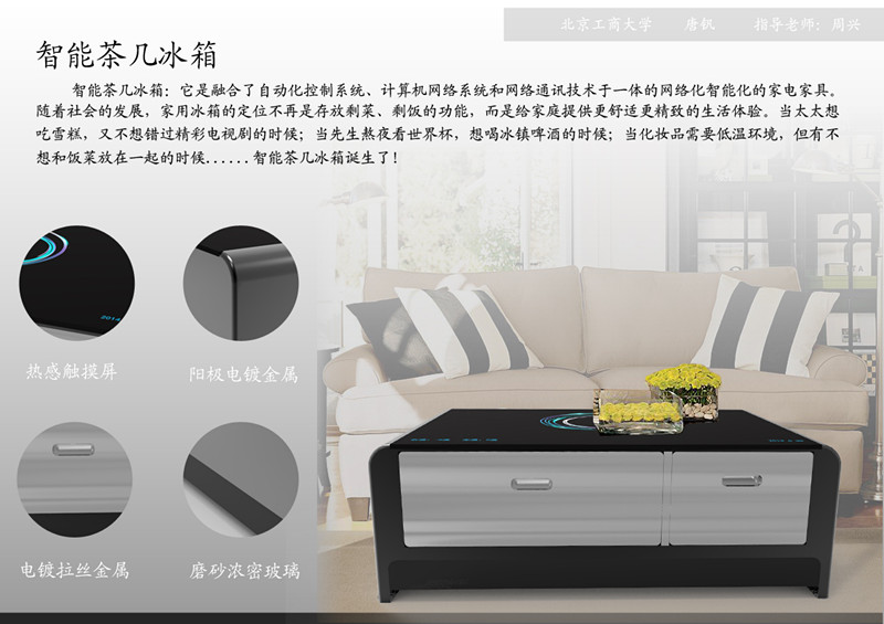 大賽設“數字化制造與設計創新”、“智能產品與服務設計創新”及“社會創新”三大組別。唐釩在指導教師周興的指導下,以設計項目“智能茶幾冰箱”參加了“智能產品與服務設計創新”組別的競賽。該設計把家電和家居相結合,回歸到用戶需求的原點,同時融入物聯網的設計理念,符合智能家居家電這一未來的家居家電發展的大方向,牢牢把握消費趨勢,將關注重點放在洞察用戶需求并以創新功能來滿足用戶需求,給追求精致生活的人們以更好的生活體驗。最終該項目在來自海內外近400多份的設計作品中脫穎而出并獲得了銀獎。