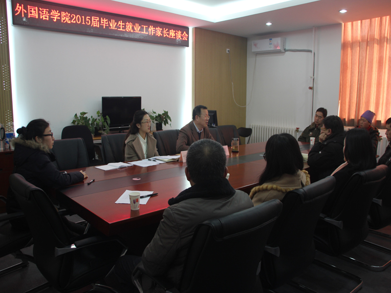 2015年全國高校畢業生總數達749萬人,再創歷史新高。針對嚴峻的就業形勢,為暢通學院與家長的交流溝通,推動畢業生就業工作的開展,努力做好就業指導服務工作,外國語學院于2015年伊始舉行2015屆畢業生就業工作家長交流座談會。院長羅朝能、黨總支副書記任金晶、輔導員以及部分家長代表參加。