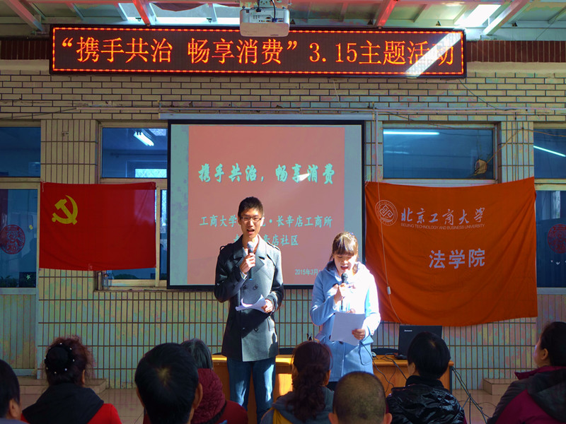 同時,法學院學生黨支部與青年志愿者協會攜手北京市豐臺區長辛店工商所前往豐臺區趙辛店社區,開展了以“攜手共治,暢享消費”為主題的3·15普法宣傳活動。同學們發揮法學專業知識,通過自編自演的小品、三句半等普及法律知識,鼓勵消費者保護自身合法權益。活動中還穿插有獎競答環節,主持人對社區群眾提出關于社會生活中較常見的問題,由同學們為搶答正確者發放不同形式的小獎品。活動結束后,同學們還為大家發放了宣傳冊,接受現場答疑。活動深受社區公民好評,收到了良好的社會效果。