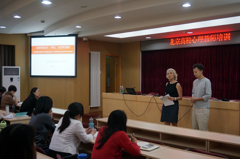 本次培訓的主題是大學生自殺心理危機的理論研究及干預技術,由來自美國的艾琳安布魯斯博士主講。在三天的講座過程中,安布魯斯博士系統介紹了關于自殺的“張力”理論,并結合從2009年至今長達6年的關于北京高校大學生的研究數據,給出了關于識別大學生自殺意圖的方法建議。培訓中進行了互動性團體輔導治療方法展示,從技術上介紹了如何積極關注學生,建立關系鏈接以及給予來訪者正向支持。