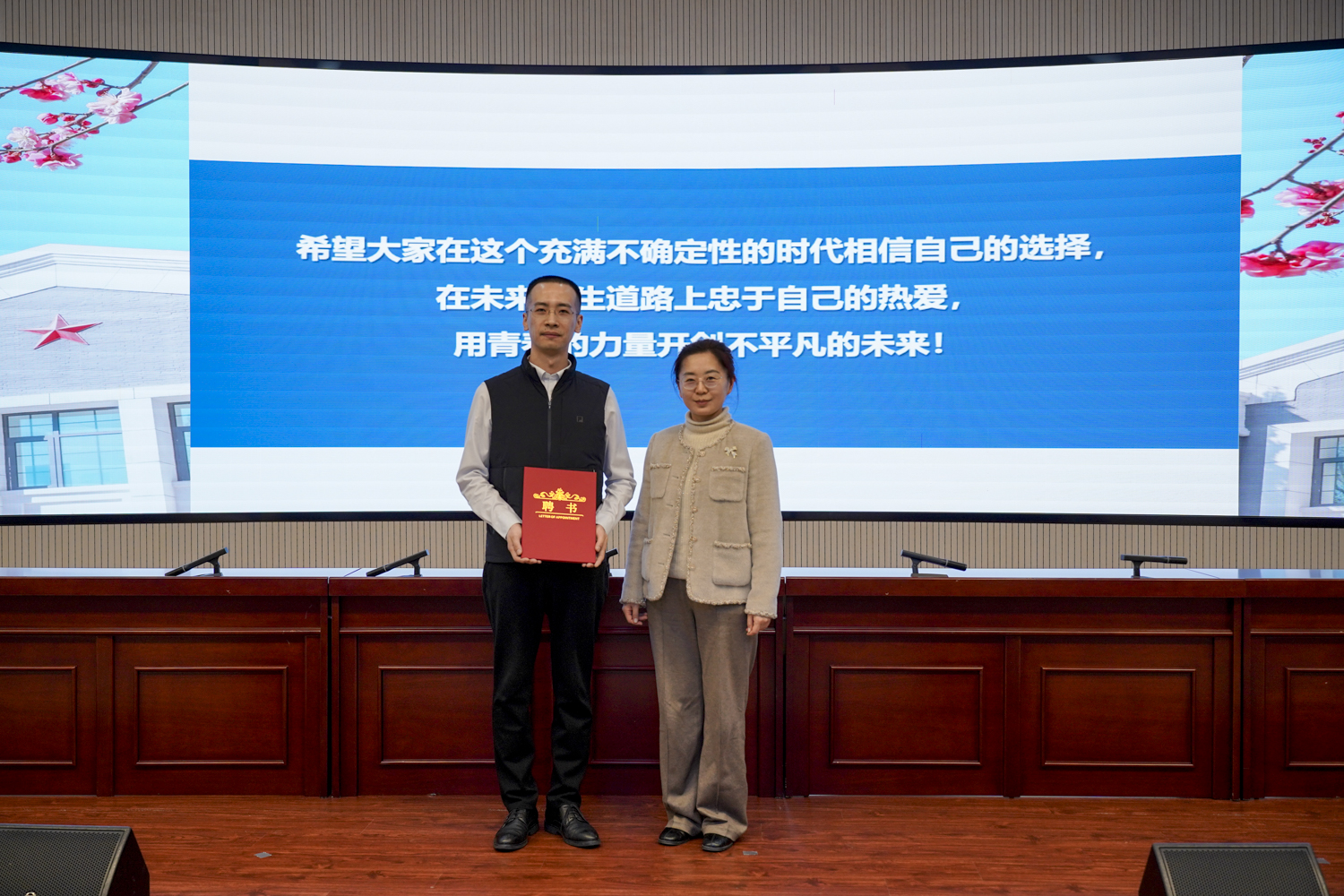 在基層就業(yè)榜樣宣講環(huán)節(jié),大興區(qū)人力資源和社會(huì)保障局辦公室主任、原計(jì)信學(xué)院計(jì)算機(jī)專(zhuān)業(yè)2015屆校友楊晨分享了他的基層就業(yè)經(jīng)歷。他從“選擇很重要,更重要的是敢于把想法付諸實(shí)踐”“付出就有回報(bào),要相信一切都是最好的安排”“要做職業(yè)規(guī)劃,但不要好高騖遠(yuǎn)”三個(gè)方面分享了他的成長(zhǎng)故事,用親身經(jīng)歷告訴學(xué)弟學(xué)妹“基層,是一個(gè)你有夢(mèng)想就能收獲成長(zhǎng)的地方”。石松為其頒發(fā)了校外就業(yè)導(dǎo)師證書(shū),希望他今后能夠?yàn)槟感5耐瑢W(xué)們帶來(lái)更多正能量的引導(dǎo)和幫助。