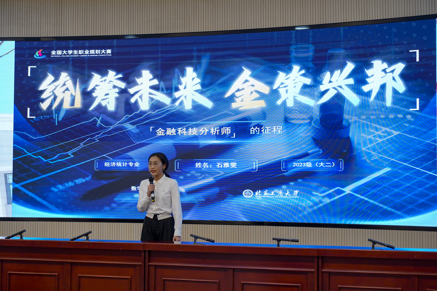 徐丹丹首先代表學(xué)校熱烈歡迎并感謝出席此次大賽的各位嘉賓,祝賀經(jīng)過(guò)初賽、復(fù)賽的層層選拔脫穎的15位選手進(jìn)入決賽。她指出,黨中央、國(guó)務(wù)院高度重視畢業(yè)生就業(yè)工作,全國(guó)大學(xué)生職業(yè)規(guī)劃大賽中就業(yè)賽道考察高年級(jí)本科生與研究生個(gè)人發(fā)展路徑與就業(yè)市場(chǎng)需求的適應(yīng)度,成長(zhǎng)賽道考察低年級(jí)本科生是否能夠樹(shù)立生涯發(fā)展理念并合理設(shè)定職業(yè)目標(biāo),對(duì)高校學(xué)子們樹(shù)立正確職業(yè)目標(biāo)、提升就業(yè)競(jìng)爭(zhēng)力大有裨益。隨后她介紹了學(xué)校在創(chuàng)新創(chuàng)業(yè)、就業(yè)規(guī)劃和就業(yè)指導(dǎo)等課程和各類(lèi)競(jìng)賽的組織和成效,分享了過(guò)往優(yōu)秀畢業(yè)生的多樣職業(yè)選擇,用奔赴新疆、內(nèi)蒙基層就業(yè)事例,引導(dǎo)同學(xué)們重視知識(shí)、素質(zhì)和能力培養(yǎng),努力成為復(fù)合型人才,并把個(gè)人理想追求融入黨和國(guó)家事業(yè)之中,未來(lái)在基層一線和各行業(yè)領(lǐng)域建功立業(yè),為國(guó)家和社會(huì)發(fā)展貢獻(xiàn)青春力量。她希望通過(guò)此次大賽幫助同學(xué)們樹(shù)立為祖國(guó)建設(shè)和發(fā)展貢獻(xiàn)個(gè)人力量的遠(yuǎn)大目標(biāo),關(guān)注社會(huì)經(jīng)濟(jì)和行業(yè)趨勢(shì)、認(rèn)清自我定位和崗位需求,同時(shí)能夠看到多樣的職業(yè)選擇,鋪就一條屬于自己的成材之路。