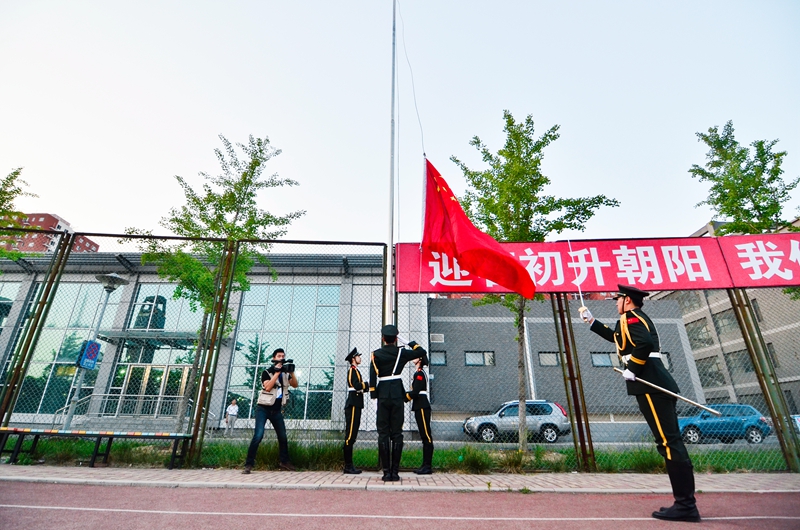 國旗手步伐整齊,英姿颯爽;全場人員共唱激昂的國歌,國旗緩緩升起。