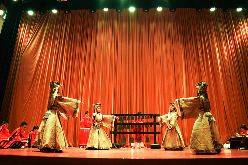 第二樂章響起的是莊重崇敬的宗廟樂,作為集歌舞禮樂于一體的祭祀儀式音樂,宗廟樂經常在重大的宗廟祭祀典禮上使用。“北京城建城3060年放在古代就是一種祭祀活動,宗廟樂不可或缺”楊春薇團長解釋道,兩首宗廟樂-—《維天之命》《肆夏》的演奏也表達出中國人對天地和祖先的敬畏之情。