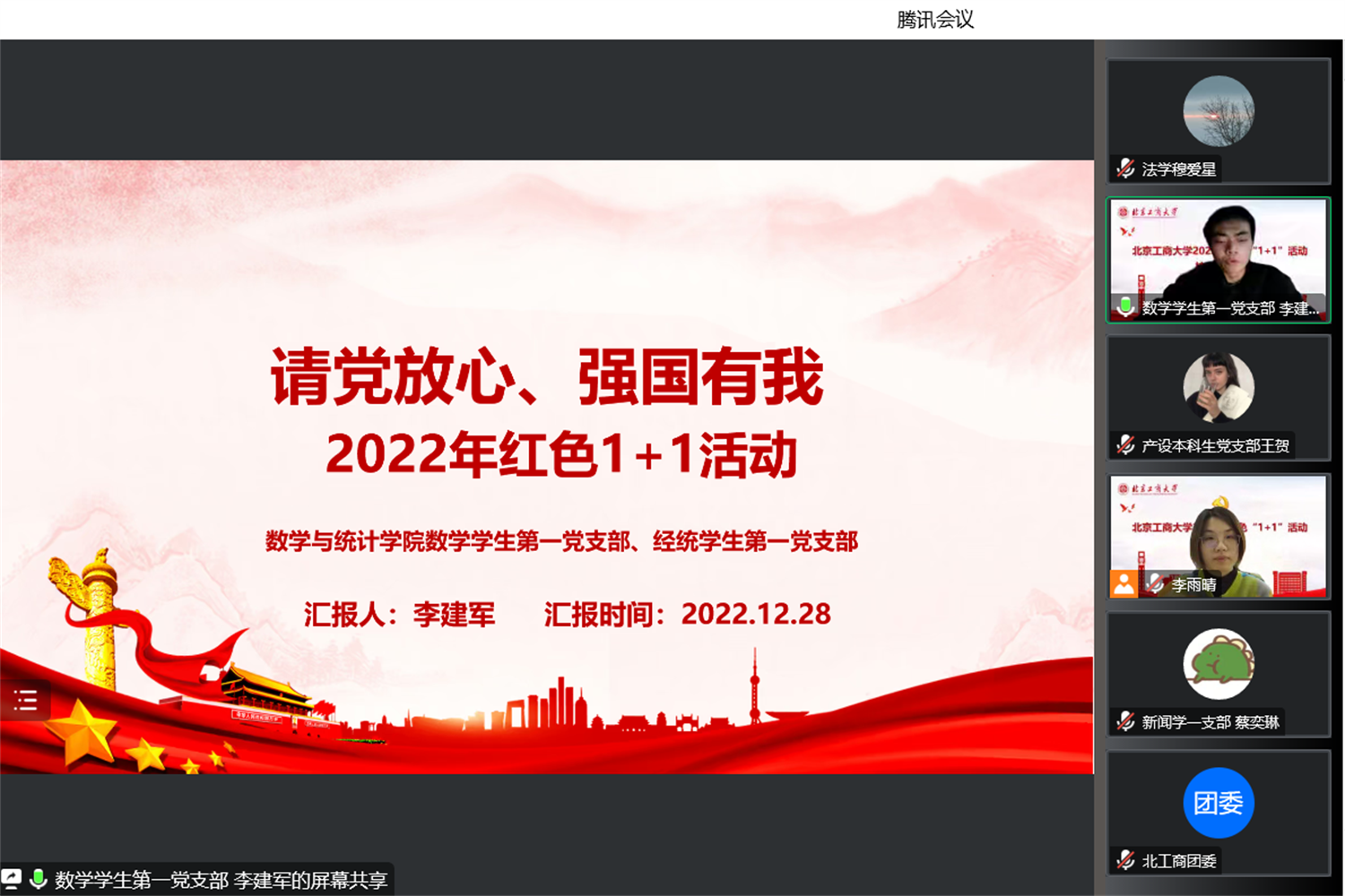 今年的紅色“1+1”活動(dòng)以“請(qǐng)黨放心 強(qiáng)國(guó)有我”為主題,緊密?chē)@學(xué)習(xí)宣傳貫徹黨的二十大精神這一中心內(nèi)容展開(kāi)。我校共有15個(gè)黨支部完成共建任務(wù),經(jīng)申報(bào),12個(gè)支部進(jìn)入最終的評(píng)審環(huán)節(jié)。評(píng)審會(huì)上,各學(xué)生黨支部通過(guò)5分鐘展示再現(xiàn)了本支部與共建單位開(kāi)展的各項(xiàng)活動(dòng)。