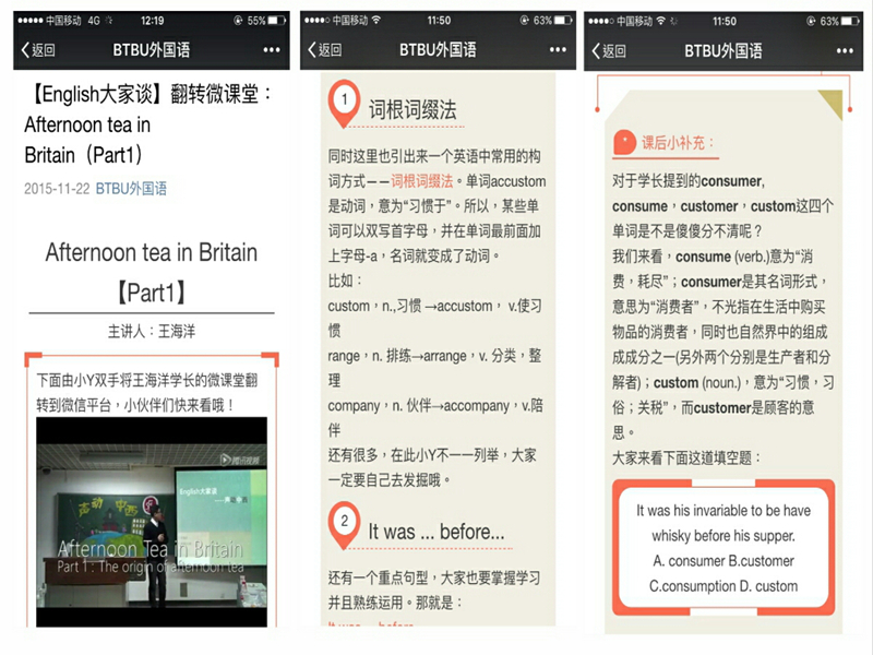 另外,學院以專業教師、外籍教師為指導教師,對精小導師進行精心指導,進行微課專業設計。同時,組成翻轉微課堂團隊,對微課進行實時錄像,制作翻轉微課堂教學視頻,總結課堂知識要點,拓展語言文化內容,定期發布學院官方微信,保證線上線下不斷線,溫故知新,形成閉環學習效果。