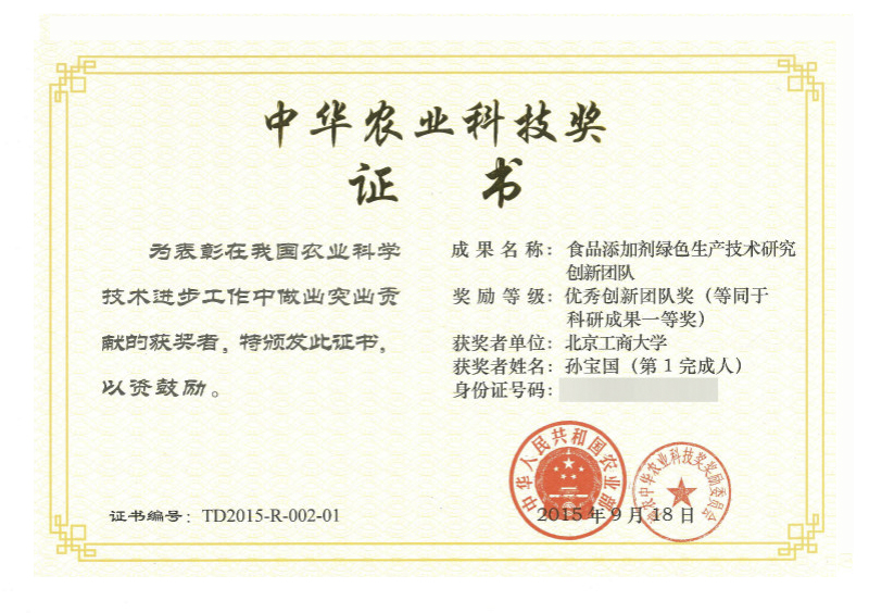 近日,由我校校長孫寶國帶領的“食品添加劑綠色生產技術研究創新團隊”榮獲農業部中華農業科技獎一等獎(等同于科研成果一等獎)。該獎項設立于2006年,經農業部同意、科技部批準,中國農學會設立,在促進農業科技發展、推動行業科技進步中起到激勵和導向作用,重點獎勵為我國農業科學技術進步和創新做出突出貢獻的集體和個人。我校獲獎的團隊成員有孫寶國、李秀婷、曹雁平、宋煥祿、徐寶財、王成濤、鄭福平、王靜、楊貞耐、張敏、田紅玉、謝建春、陳存社、劉玉平、陳海濤、韓富、辛秀蘭、廖永紅、黃明泉、王鳳寰等。
