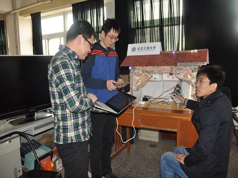 獲得特等獎(jiǎng)的@World團(tuán)隊(duì)(團(tuán)隊(duì)成員:趙宏林、郝寶智、吳文博,指導(dǎo)老師:廉小親)作品是基于物聯(lián)網(wǎng)智能家居系統(tǒng),它是一款基于IOS-App和云平臺(tái)的智能控制系統(tǒng)。該系統(tǒng)實(shí)現(xiàn)了使用App遠(yuǎn)程監(jiān)控屋內(nèi)空調(diào)、熱水器及相關(guān)設(shè)施的功能。其中云平臺(tái)提供了在線數(shù)據(jù)交換功能,使遠(yuǎn)程控制功能得以實(shí)施。用戶通過手機(jī)APP來(lái)控制家居,實(shí)現(xiàn)對(duì)家居的遠(yuǎn)程操控,控制過程中使用WiFi或GSM的網(wǎng)絡(luò)連接均可。