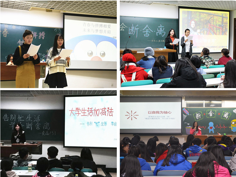 “生活加減法”工作室由學校學生處牽頭成立,由外國語學院輔導員張悅主持創辦。工作室緊密結合大學生成長成才需求,尤其針對新生入學后在時間規劃、學習規劃、生活規劃等方面存在的疑惑和問題,以新生入學第一年為時間節點,圍繞輔導員工作中新生教育、自我管理、習慣養成等問題,探索全新教育引導模式。工作室成立兩年多來,努力倡導“斷舍離”的生活理念,結合學生的學業需求、成長發展、心理特點,通過時間管理、學習管理、宿舍管理、心理管理四大主題活動,引導學生做好學習生活“加減法”,學會“斷舍離”,明確目標,增強自我管理能力。2015年,結合新生入學教育,根據學生處的要求,生活加減法工作室針對大一新生策劃組織了告別忙生活,學會斷舍離”的主題班會,2015級全部班級參加。此外,工作室還策劃了大“忙”人還是大“盲”人的情景劇表演,活動形式新穎,主題明確,對學生有較好的教育引導作用。