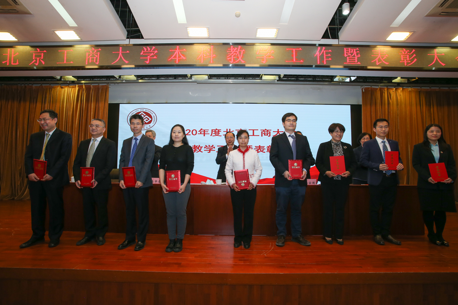 黨委副書記李中奇宣讀了《北京工商大學2020年度本科教學工作暨表彰大會獲獎名單》。伴隨著熱烈激昂的樂曲,與會校領導為獲獎教師代表頒發了獎勵證書。