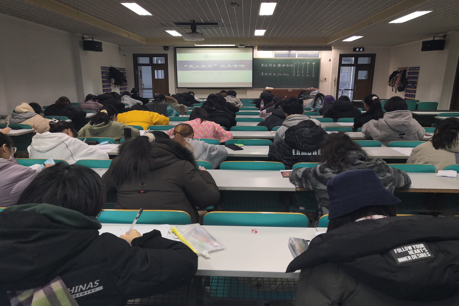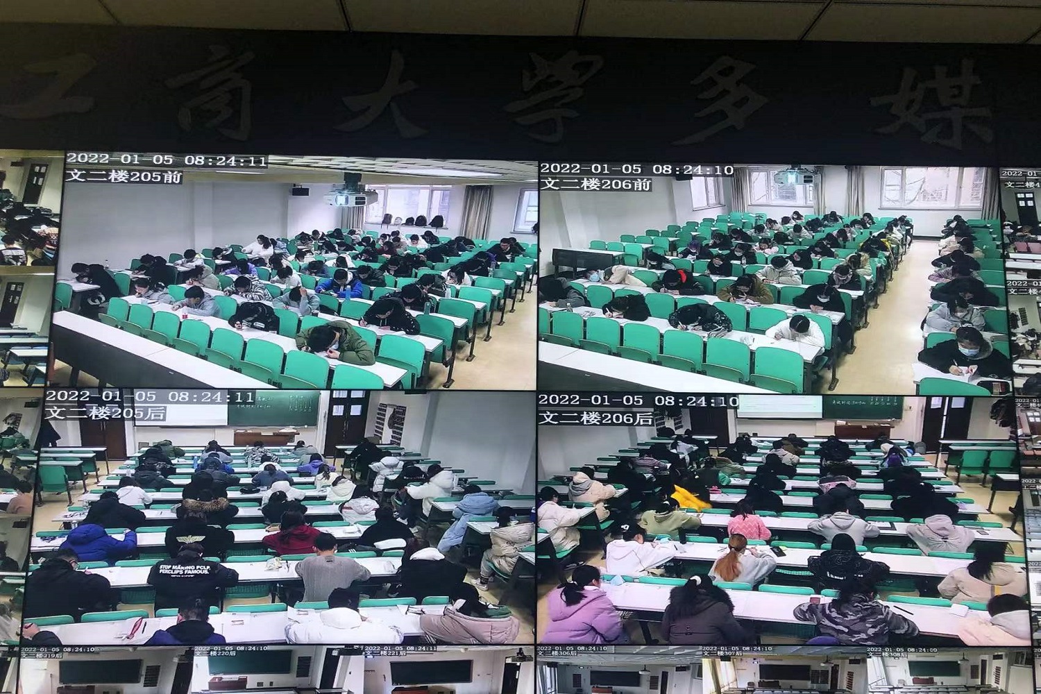 前期籌備階段,學(xué)生處制定了周到細(xì)致的《“無人監(jiān)考”誠(chéng)信考場(chǎng)試點(diǎn)工作方案》,選定2021級(jí)人工智能學(xué)院高等數(shù)學(xué)(上)和商學(xué)院微積分(上)作為試點(diǎn)考試科目,通過學(xué)生自愿報(bào)名的方式挑選參加試點(diǎn)考試學(xué)生,教務(wù)處、學(xué)生處共同提前踏勘選定符合“無人監(jiān)考”基本條件的文二205、206教室作為試點(diǎn)考場(chǎng),并對(duì)考場(chǎng)視頻監(jiān)控設(shè)備進(jìn)行了測(cè)試。學(xué)生處編制《自愿參加“無人監(jiān)考”考試承諾書》《“無人監(jiān)考”考場(chǎng)注意事項(xiàng)》,讓參加試點(diǎn)考試的學(xué)生全面了解考試的目的意義、相關(guān)要求和考試流程。考試現(xiàn)場(chǎng),考生到達(dá)考場(chǎng)后須持有效證件,站在預(yù)先設(shè)定好的“照相區(qū)”面向攝像頭進(jìn)行視頻自動(dòng)打卡。監(jiān)考教師考試開始后15分鐘內(nèi)負(fù)責(zé)發(fā)放試卷、解答學(xué)生問題,之后離開考場(chǎng),在中控室觀察學(xué)生表現(xiàn),現(xiàn)場(chǎng)進(jìn)入“無人監(jiān)考”狀態(tài)。考試結(jié)束前10分鐘,監(jiān)考教師再返回考場(chǎng)收取試卷。期間如有學(xué)生提前交卷,可向攝像頭舉手示意,將試卷倒扣在桌面后自行離開考場(chǎng)。如有學(xué)生出現(xiàn)突發(fā)情況,可通過教室前側(cè)的固定電話撥打“0”報(bào)告,監(jiān)考教師會(huì)立即返回考場(chǎng)進(jìn)行處理。