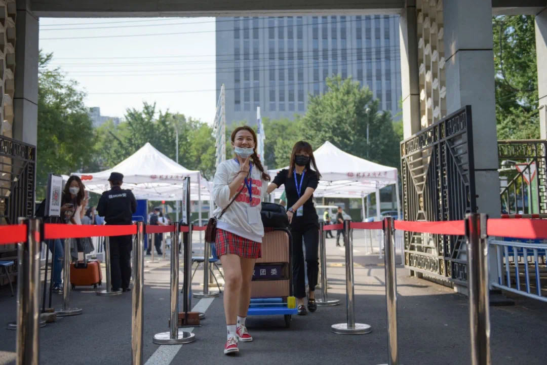 校門引導、身份檢測、健康測溫,驗證健康綠碼和行程綠碼入校,新生們在安保人員的引導下有序進入校門。