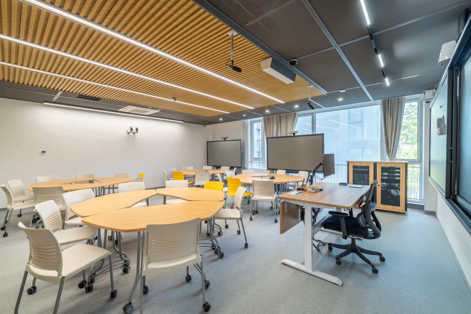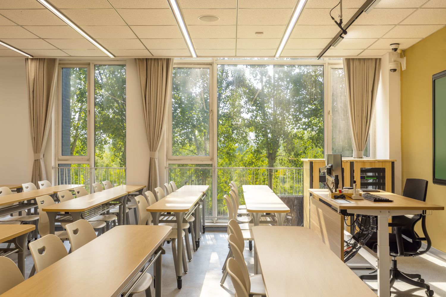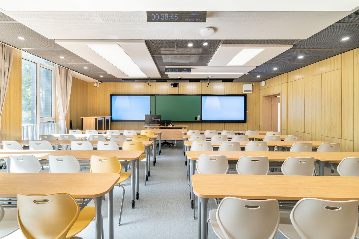 新建智慧教室登錄騰訊便可調用教室內攝像頭,跟蹤教師走動位置,便于線上學生觀看教師授課、板書及互動,實現了線上線下混合式教學;提供了大屏、記憶黑板、電子白板、玻璃白板、實物展臺等多種書寫方式,每間教室黑板多層可推拉,大大增加了書寫面積,實現了自由自主、隨心便捷的書寫模式;考慮到大教室幕布遮擋黑板的情形,中控面板首頁設置了一鍵幕布升降功能,教師可隨手調整幕布升降,免去了遮擋困擾;設置多種擴聲模式,“一師一麥”、“一室一麥”,輔助吊麥,手持買和吊麥在不同區域講話自動切換,教師即使未攜帶任何擴聲設備,也不用擔心授課擴聲問題;電子時鐘雙面顯示,無論教師還是學生微微抬頭便可輕松觀看時間;教室內教師機顯示器采用大屏超薄配置,可觸控、可書寫,自帶隱藏式攝像頭,360度可旋轉,便利教師教學;教室內使用U盤錄制的課堂實錄,下課拔走即帶走,無需手動下載;教師講臺可升降,配有無塵膜衣粉筆、硬質粉筆、軟質粉筆、噴水板擦、干濕兩用板擦、電子教鞭、眼鏡收納,講臺邊配有水杯托、衣帽鉤,學生桌椅也配有桌斗,方便師生放置個人物品。類似的人性化設計細節還有很多,教務處始終秉持教學服務沒有止境的理念,用心設計和處理每一處細節,也將在后續教學過程中不斷聽取師生的使用意見反饋,積累完善,精益求精。