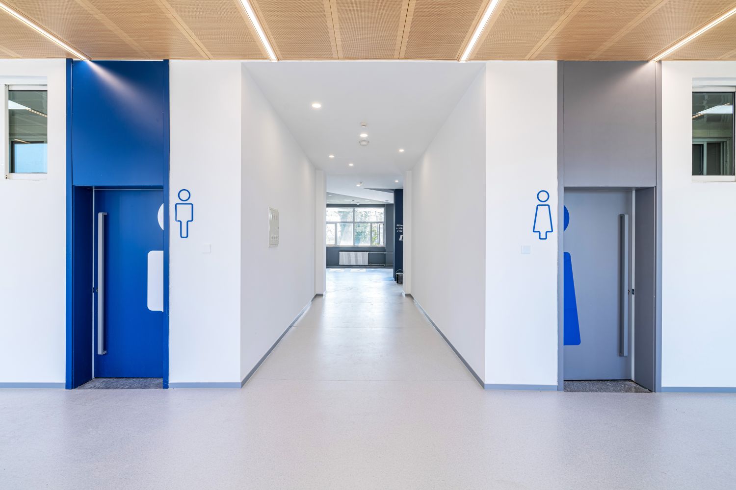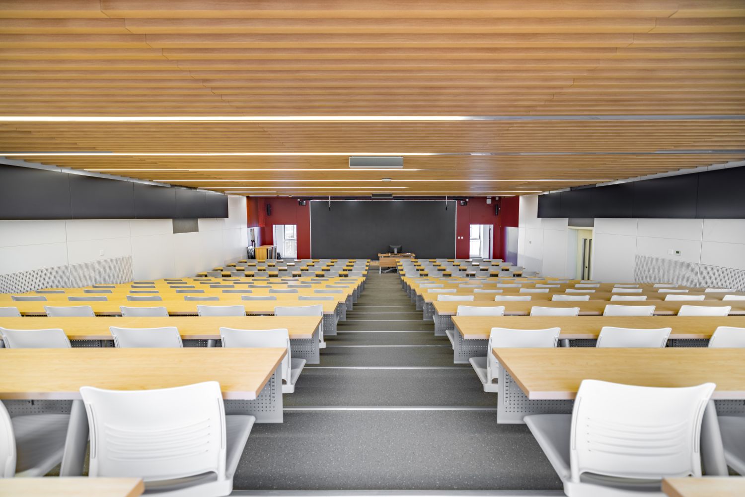 文二樓二、三層的精品教室以木色為主題色,并在家具上點綴樓層主題色,使教室內與公共空間呼應結合。四層的特色學科教室則按照各學科院色區分,使學生對所在的學習環境及學科專業產生歸屬感。四層新工科階梯教室則采用食品與健康學院綠色;新商科階梯教室的主題色采用商學院的紅色;藝術類階梯教室主題色采用傳媒與設計學院的藍色。