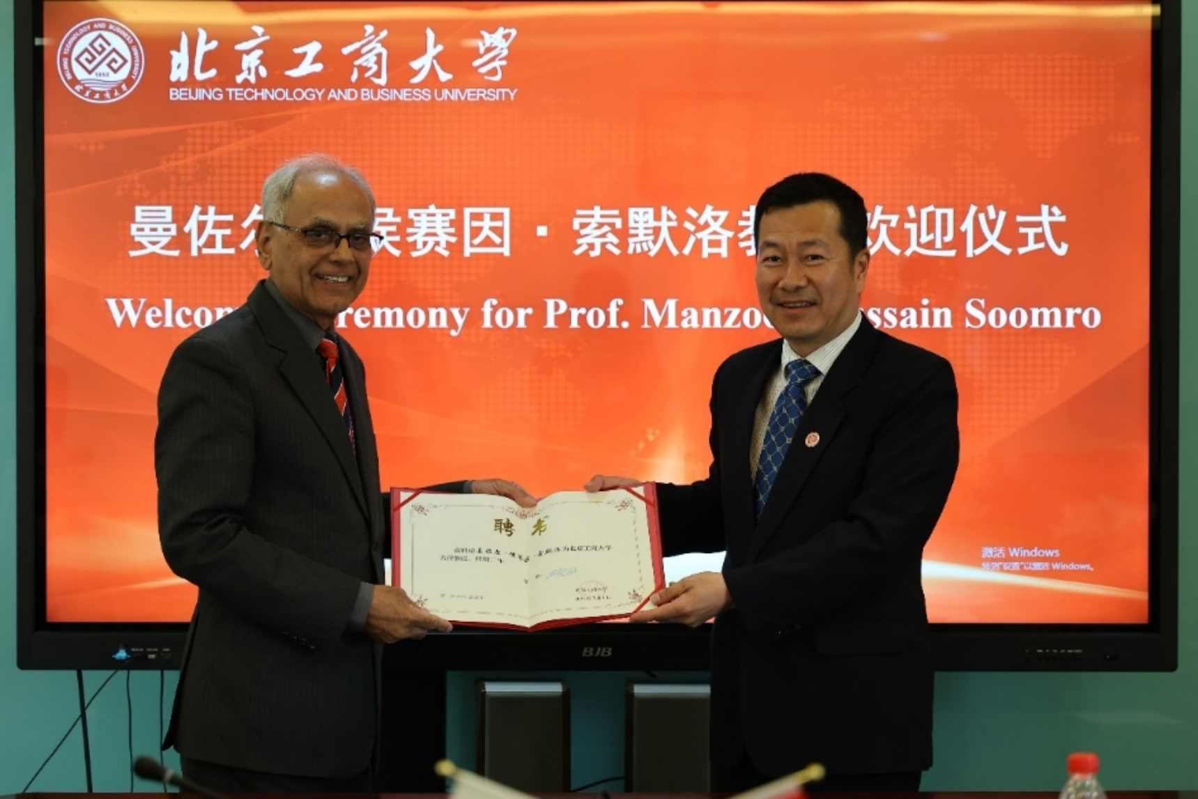 5月10日,學校名譽教授曼佐爾·侯賽因·索默洛教授(Manzoor Hussain Soomro)歡迎儀式在阜成路校區舉行。黨委常委、副校長劉敏華出席會議。國際經管學院院長詹新宇,人事處副處長錄馳沖,國際交流與合作處副處長馬雪嬌,“一帶一路”聯合培訓中心主任邸玉娜,國際經管學院數字經濟系副主任韓璐參加座談會。會議由馬雪嬌主持。