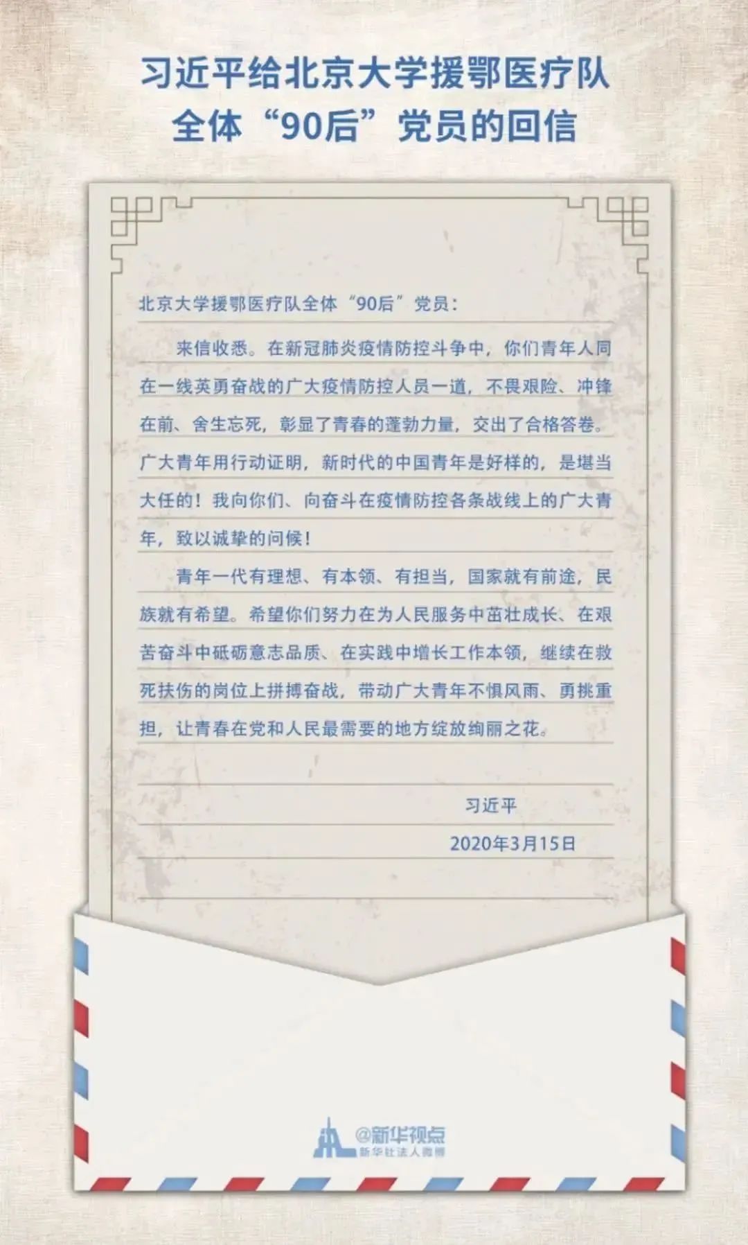 中共中央總書記、國家主席、中央軍委主席習近平3月15日給北京大學援鄂醫療隊全體“90后”黨員回信,向他們和奮斗在疫情防控各條戰線上的廣大青年致以誠摯的問候,并寄語廣大青年不懼風雨、勇挑重擔,“讓青春在黨和人民最需要的地方綻放絢麗之花”。