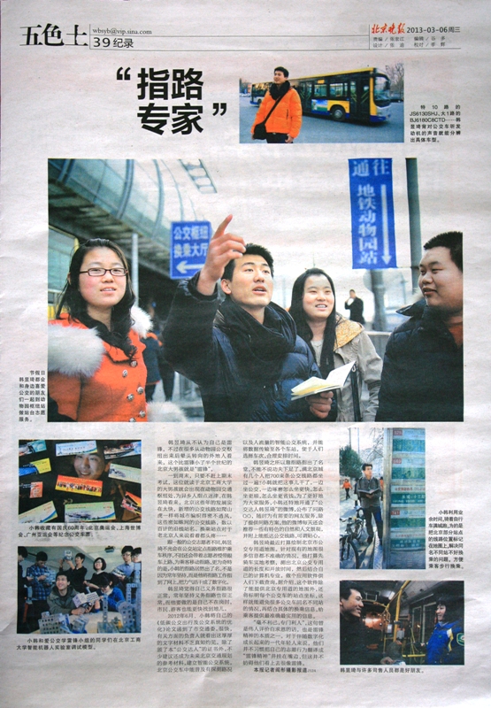 韓昱琦是我校計信學院12級軟件專業的學生,一個90后北京大男孩兒。他不僅熟知北京所有公交車的車型,還熟知北京的所有公交線路。每個周六周日,只要有時間,韓昱琦就會去做志愿者,除了在車上為大家服務,他還經常去北京客流最多的地點之一——動物園公交樞紐的公交車站臺上為乘客答疑、指路。在城市擁堵成大難題的今天,他經過近一年的考察與研究,向北京市交通委提交了《低碳公交出行及公交系統的優化》的論文。他被北京市交通委授予了“公交達人”的稱號。