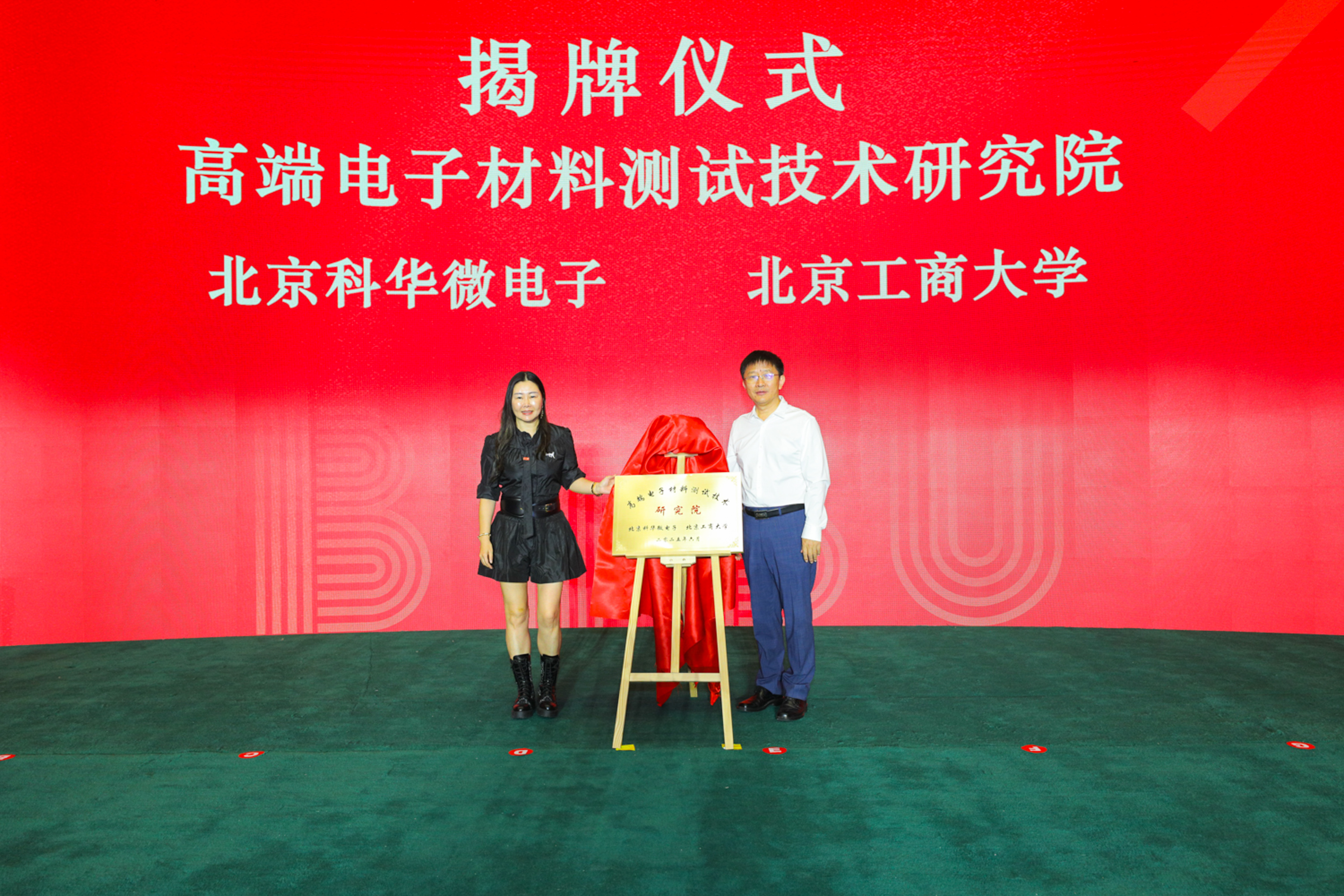 大會成立“北京科華微電子 - 北京工商大學高端電子材料測試技術研究院”。93級化工系校友、彤程新材料集團股份有限公司董事長張寧與北京工商大學校長郭建華共同揭牌。