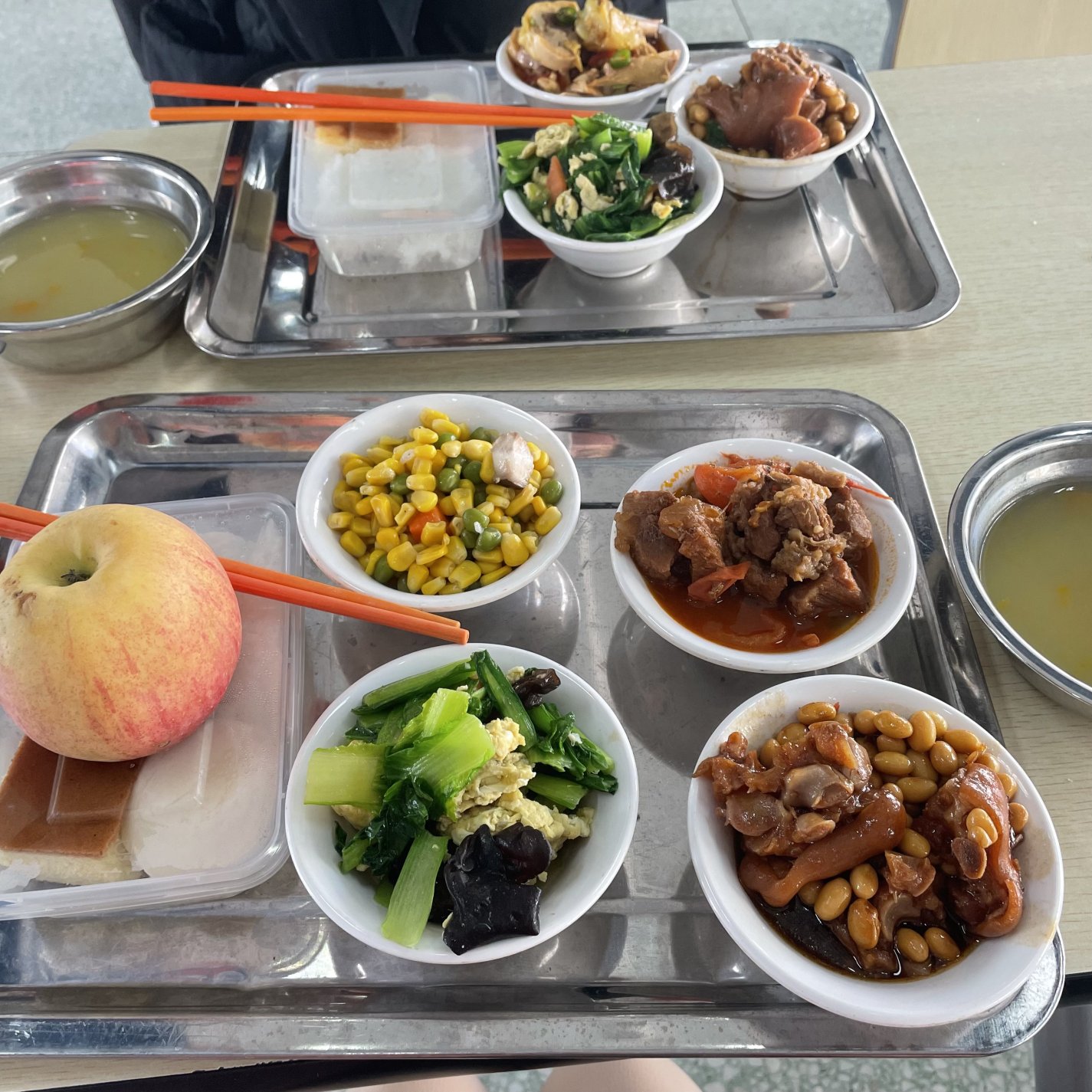 西紅柿牛腩、黃豆燒豬蹄、清炒玉米粒、油菜雞蛋,外加一個蘋果……大年三十當(dāng)天,北京工商大學(xué)食品與健康學(xué)院研三學(xué)生金燕京在食堂享用了免費午飯和晚飯。