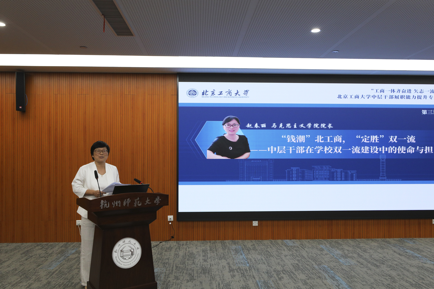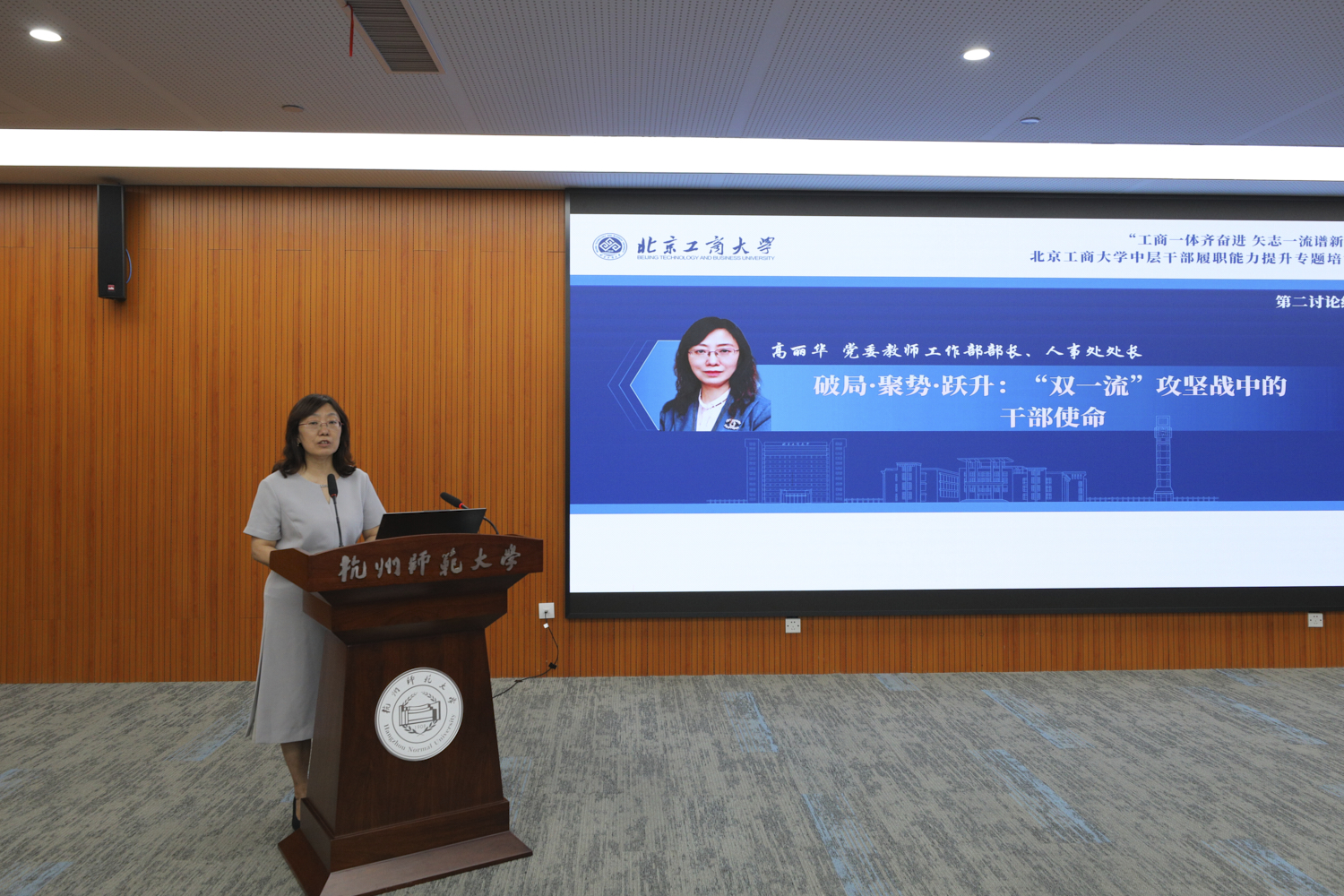 7月14日,在杭州師范大學舉行開班儀式。國家教育行政學院進修一部副主任楊中超主持儀式并宣讀培訓紀律,楊紅、寇紅江為培訓班授旗,宋曉欣作培訓動員講話。