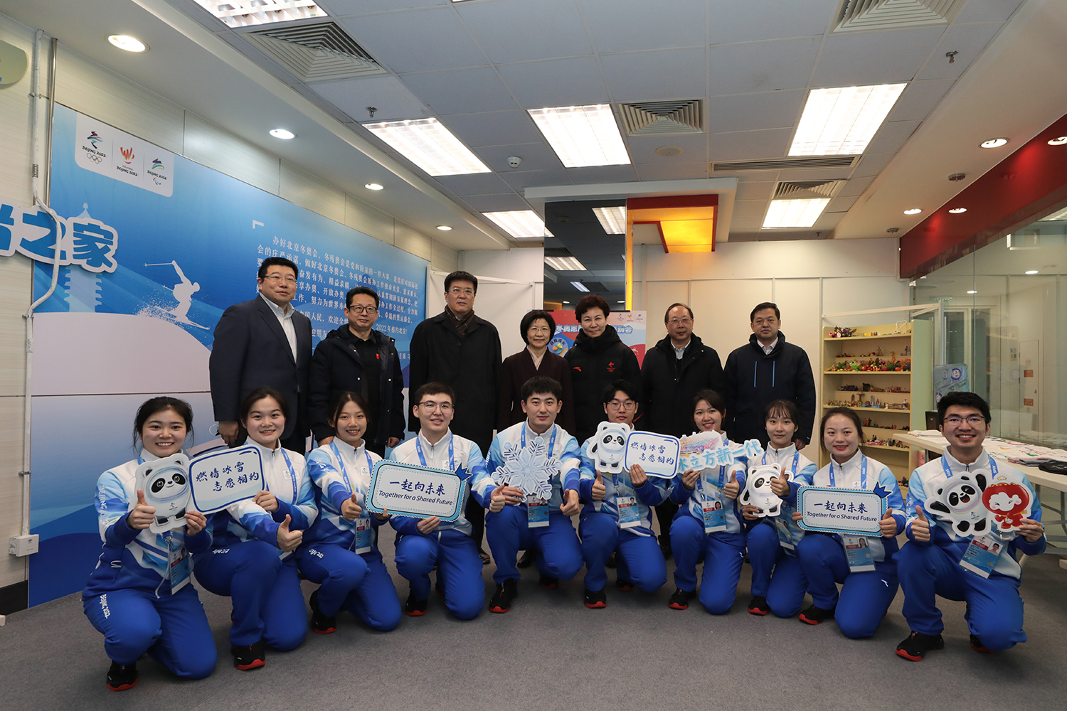 孫梅君部長還參觀了冰立方場館志愿者之家。黨委書記黃先開向孫梅君部長一行詳細介紹了我校冬奧會志愿服務保障工作。志愿者們介紹了志愿者之家的設計和構思,并展示了學校為志愿者準備的各類激勵保障物資,介紹了賽時志愿者心理疏導熱線。孫梅君部長對我校志愿者在冬奧會測試賽中的優異表現表示贊揚,對我校自冬奧會志愿服務籌備以來的各項工作予以大力肯定,并對志愿者提出三點要求:一是希望志愿者學習貫徹習近平總書記關于冬奧會籌辦的系列重要指示精神,為冬奧會提供高質量服務;二是希望冬奧賽會志愿者在賽時要展示大國風采,貢獻青春力量,在服務過程中做到“精細、精準、精致”;三是希望志愿者在冬奧會志愿服務過程中要把握機遇、不斷提升,同時也要注意勞逸結合,做好個人防護。孫梅君部長勉勵志愿者:“就像習近平總書記在新年賀詞中說的那樣 ‘我們將竭誠為世界奉獻一屆奧運盛會。世界期待中國,中國做好了準備’,希望志愿者們也做好充足的準備,展現青年風采,體現青年風貌。你們將是北京最亮眼的名片。”