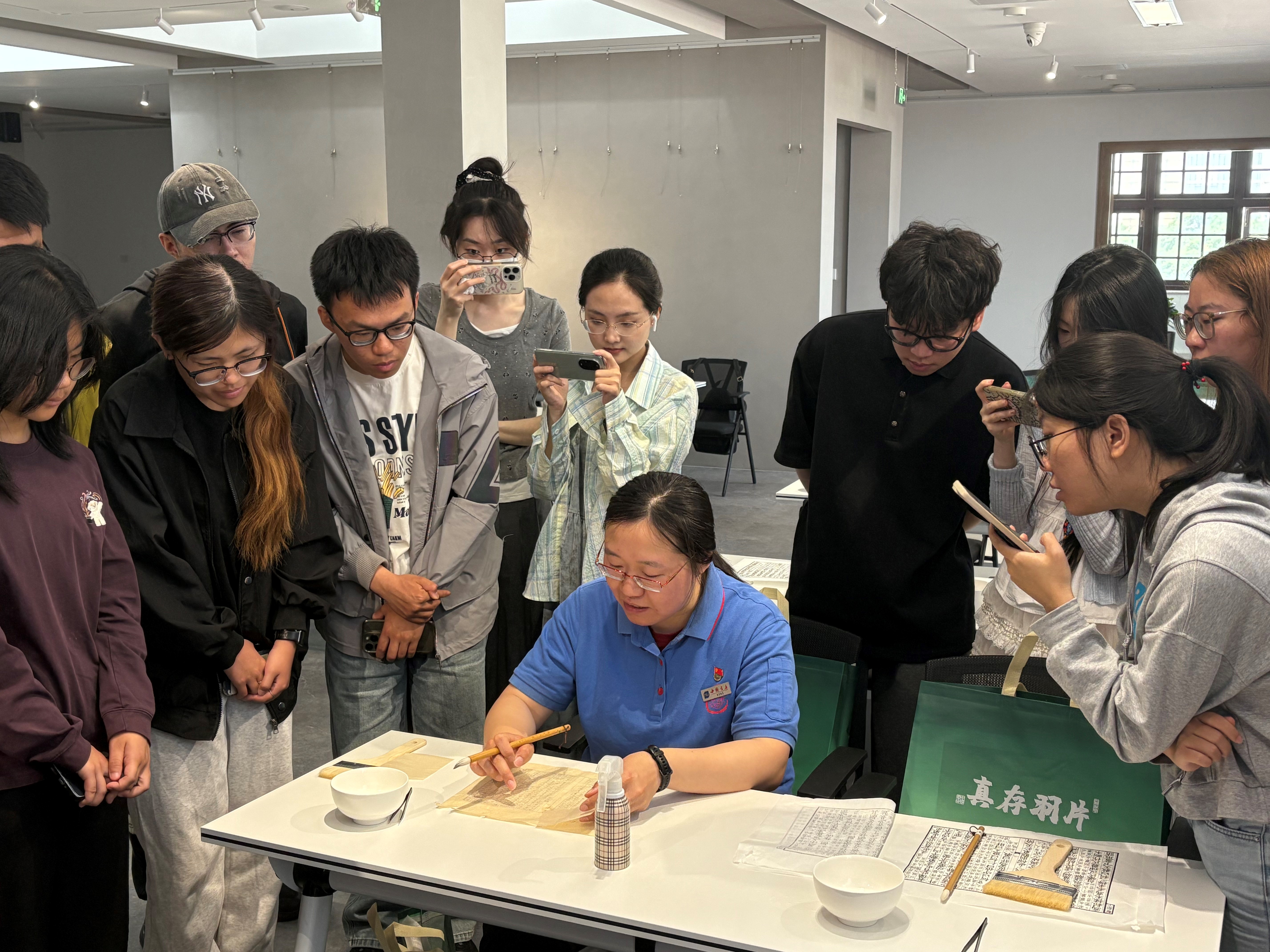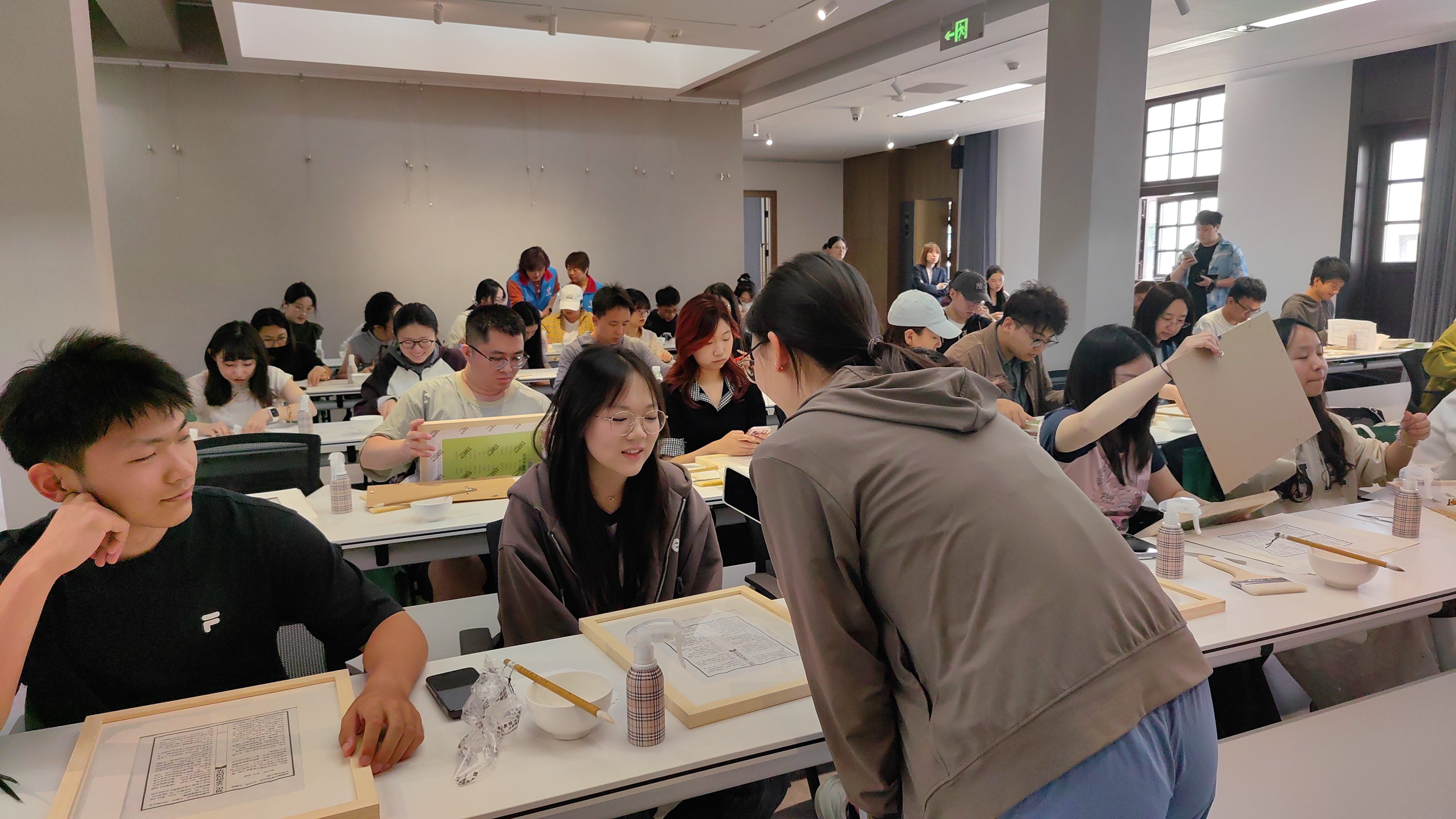 隨后在老師的指導下,師生們逐步實踐了除塵、補缺等傳統修復工序。每一個步驟輕撫過紙張,都能體會到非遺技藝在腐朽書頁間蓬發而出的生命力。過程中,大家用特制的漿水浸濕書頁破損的四周,隨后用補紙填補書頁的蟲蛀與磨損。在修復古籍的方寸之間,觸摸歷史的痕跡,師生們深切感悟到文化的厚重與魅力。