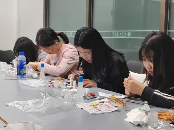 主持人介紹了掐絲琺瑯的歷史淵源和工藝特點,并逐步講解了書簽制作的步驟。同學們專注地用鑷子進行掐絲,小心翼翼地將線稿圖案粘貼在書簽上,聚精會神地填充彩砂,在光影交錯間感受傳統工藝的精細與嚴謹。經濟學院田同學表示:“親手制作出的這件書簽,不僅僅是一份紀念品,更是一段文化記憶的載體。希望未來能有更多這樣的機會,讓我們在忙碌的學習生活中,能靜下心來與傳統對話。”