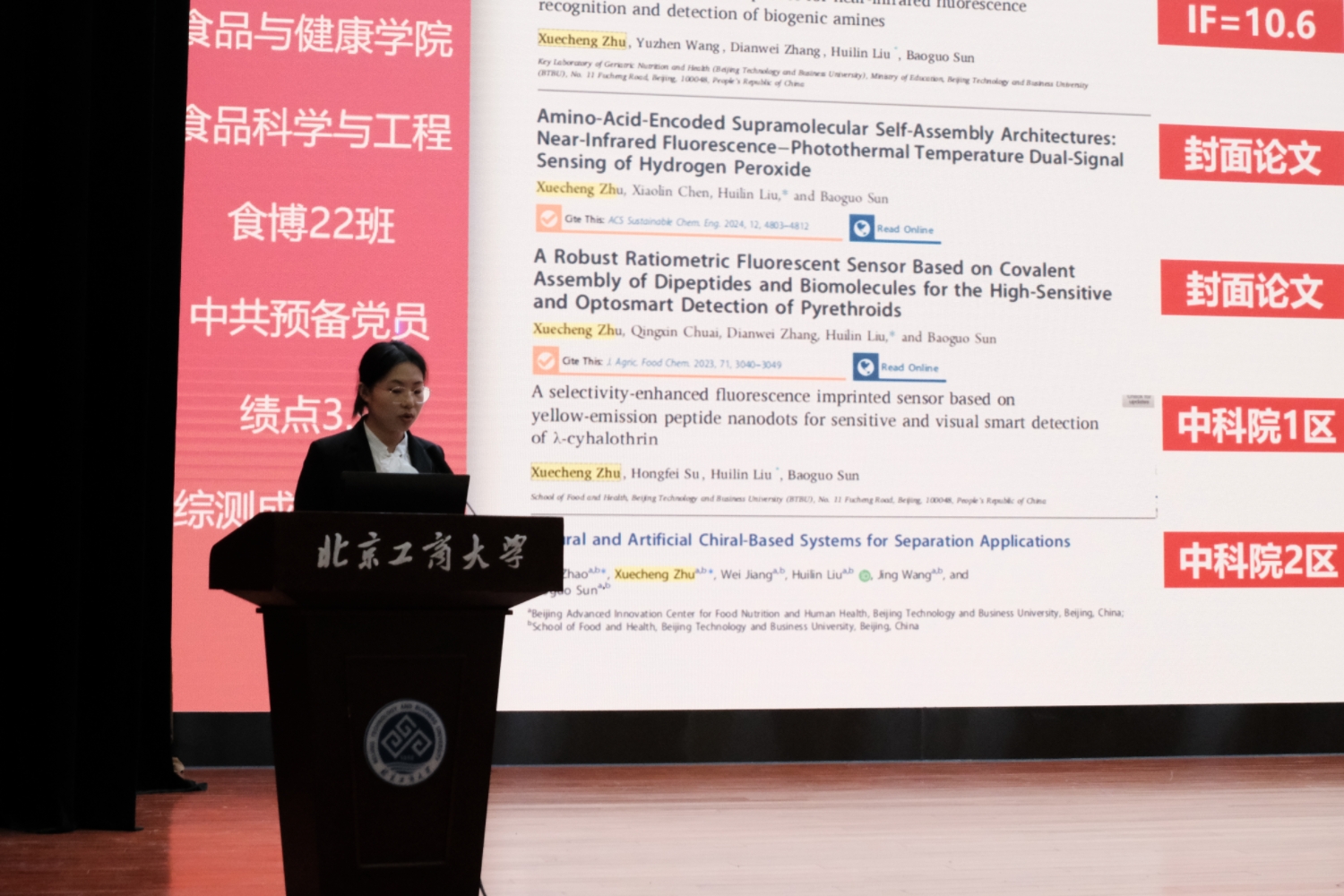 按照“公平、公正、公開、擇優(yōu)”的原則,答辯分為博士組、學碩組和專碩組三個類別依次進行。共有30名候選人參與答辯,包括博士研究生9人、學術型碩士8人、專業(yè)型碩士13人。在限時3分鐘的陳述中,候選人圍繞思想品德、學業(yè)成績、科研與實踐成果、發(fā)展?jié)摿Φ确矫嬲归_匯報。在緊張而有序的答辯會上,優(yōu)秀學子們盡展風采,他們圍繞學業(yè)成績、科研創(chuàng)新與社會實踐等多個維度,全面而精煉地匯報了自己在過去一學年中的成長與收獲。在學業(yè)方面,候選人們展現(xiàn)了扎實的專業(yè)功底,多位同學學業(yè)成績名列前茅;在科研領域,李忍同學自入學以來,以第一作者身份累計發(fā)表SCI論文9篇,全部為中國科學院TOP期刊論文,其中3篇影響因子超過10,1篇入選高被引論文;獲得授權發(fā)明專利1項,參編學術著作1部,該著作已被隆平水稻博物館永久收藏;同時,擔任Journal of Cereal Science、Natural Product Communications和Applied Food Research等多個國際期刊的審稿人。在學科競賽方面,孫璐瑤同學作為核心研發(fā)人員及答辯成員在第十九屆“挑戰(zhàn)杯”全國大學生課外學術科技作品競賽“揭榜掛帥”專項賽中獲國家級特等獎及項目擂主;在“互聯(lián)網+”“青創(chuàng)北京”“京彩大創(chuàng)”等各類競賽中均榮獲省市級以上獎項。在社會實踐與綜合素質方面,多位候選人分享了在學生工作、志愿服務、社會調研、企業(yè)實習等方面的豐富經歷,展現(xiàn)了新時代研究生知行合一、擔當奉獻的全面素養(yǎng)。