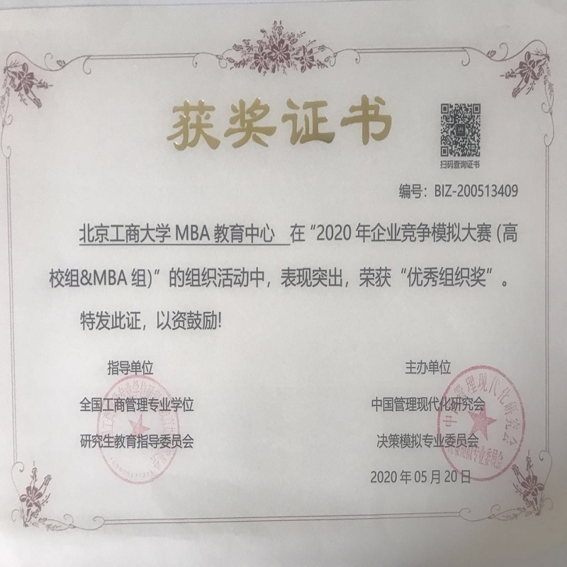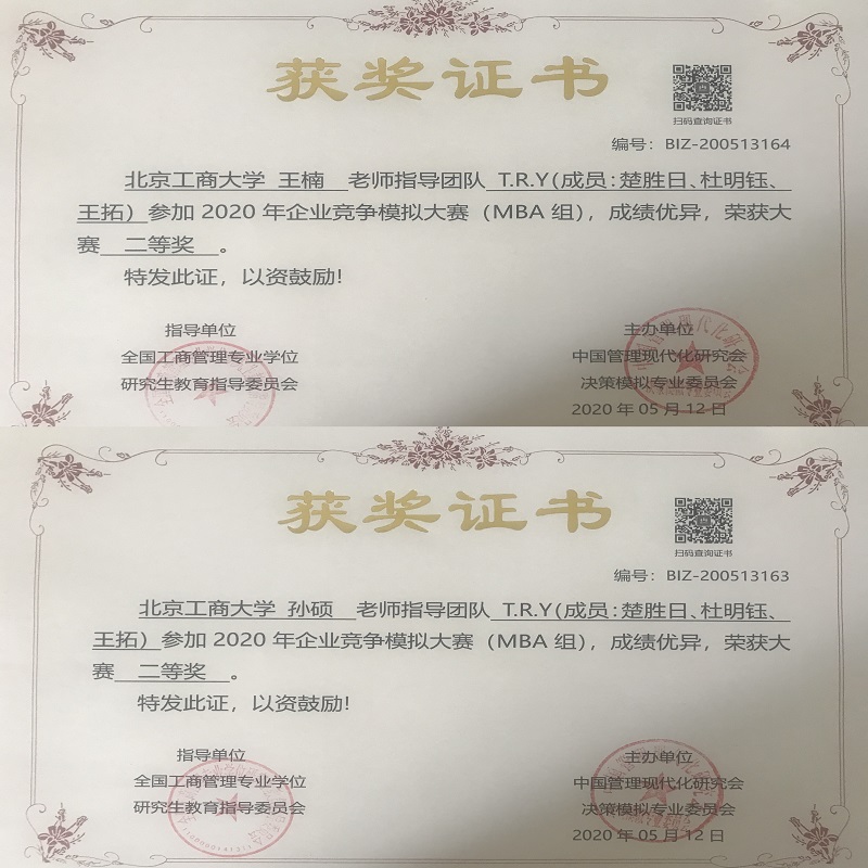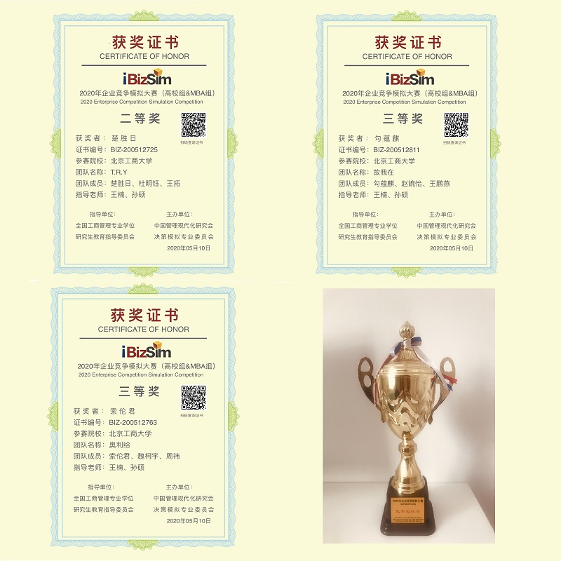 5月10日,2020年企業競爭模擬大賽(高校組&MBA組)落幕,我校MBA教育中心七支MBA隊伍參賽,榮獲一個二等獎,兩個三等獎,指導教師王楠、孫碩榮獲優秀指導獎,北京工商大學MBA教育中心榮獲優秀組織獎。