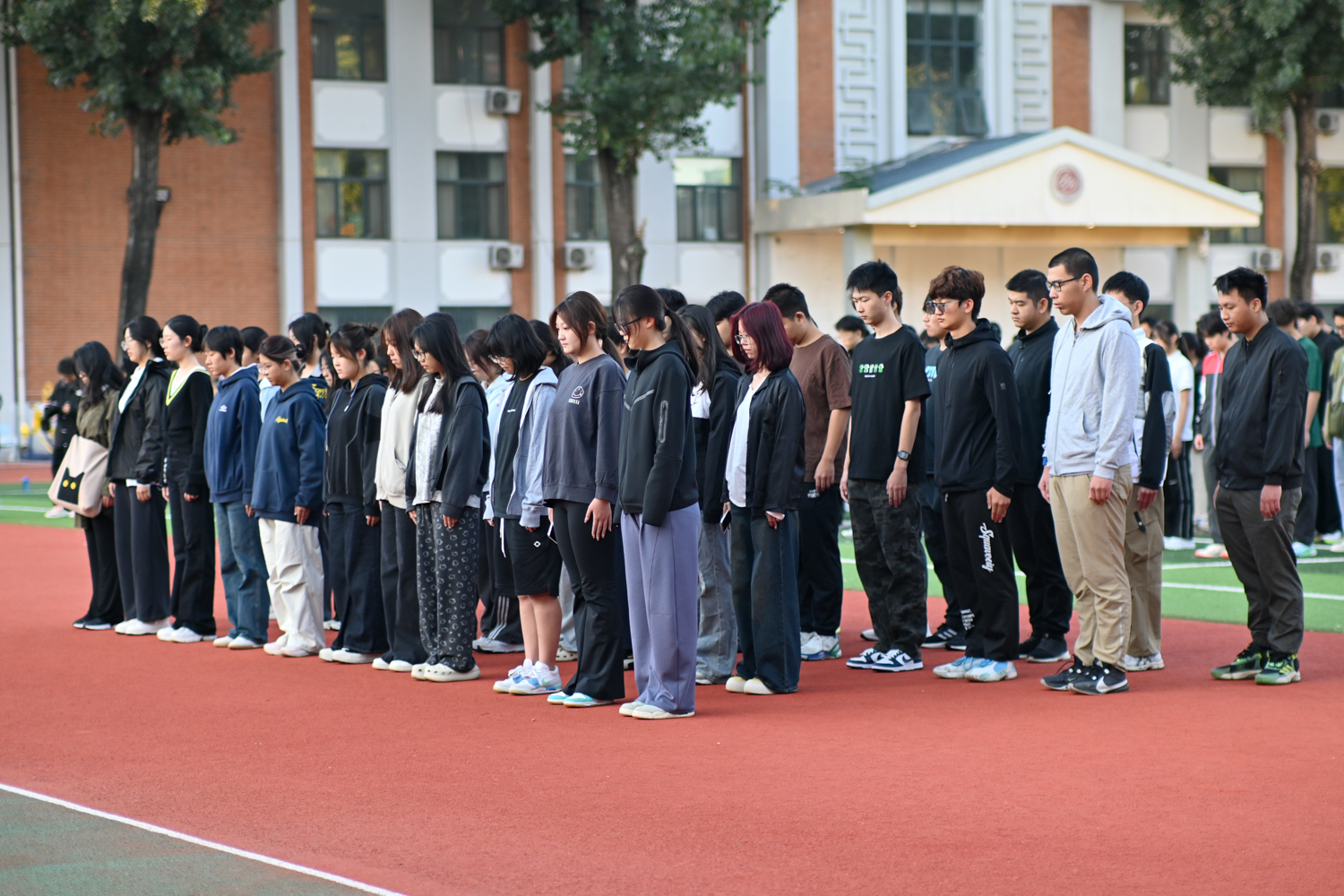 升旗儀式結(jié)束后,全場肅立,向在“九一八”事變中遇難的同胞、為民族獨立解放犧牲的革命英烈默哀。時間仿佛回到那段山河破碎的歲月,提醒著在場每一名師生:和平來之不易,歷史不容遺忘。