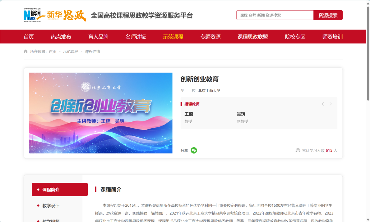 本次上線的《創新創業教育》課程起始于2015年,是突出我校商科特色優勢學科的一門重要校定必修課,每年面向全校1500左右經管文法理工等專業的學生授課,思政資源豐富,實踐性強,輻射面廣。2021年獲評北京工商大學精品共享課程培育項目,2022年課程組教師獲北京市青年教學名師,2023年獲北京工商大學課程思政優秀課程、課程組成員獲北京工商大學課程思政優秀教師一等獎,同年獲商學院教育教學改革示范課程、思政教學案例特等獎、一等獎4項。課程組成員先后編寫《可持續社會價值創新經典案例》《中小型生產性服務企業創新管理案例研究》等案例集,成立“創新創業協會”和“科技創新協會”學生社團,共建房山區琉璃河鎮賈河村、長陽鎮萬和家園社區等16個實踐教學基地。近3年課程組教師指導227項國家、省部級競賽獎,其中“互聯網+” 63項,“挑戰杯”138項。