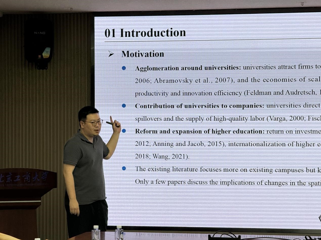 張凡老師報告了論文“More than a new campus: University's spatial expansion, emerging knowledge cluster, and innovation growth”。通過空間計量模型和雙重差分(新校區建設沖擊)的方法,研究了大學空間擴張對區域創新的影響。得出大學擴張通過知識溢出效應促進周邊創新集群形成,效應在理工科院校更顯著的結論。隨后,汪念玲教師點評建議需驗證機制(如產學研合作),建議分析政策配套(如人才引進)的調節作用。