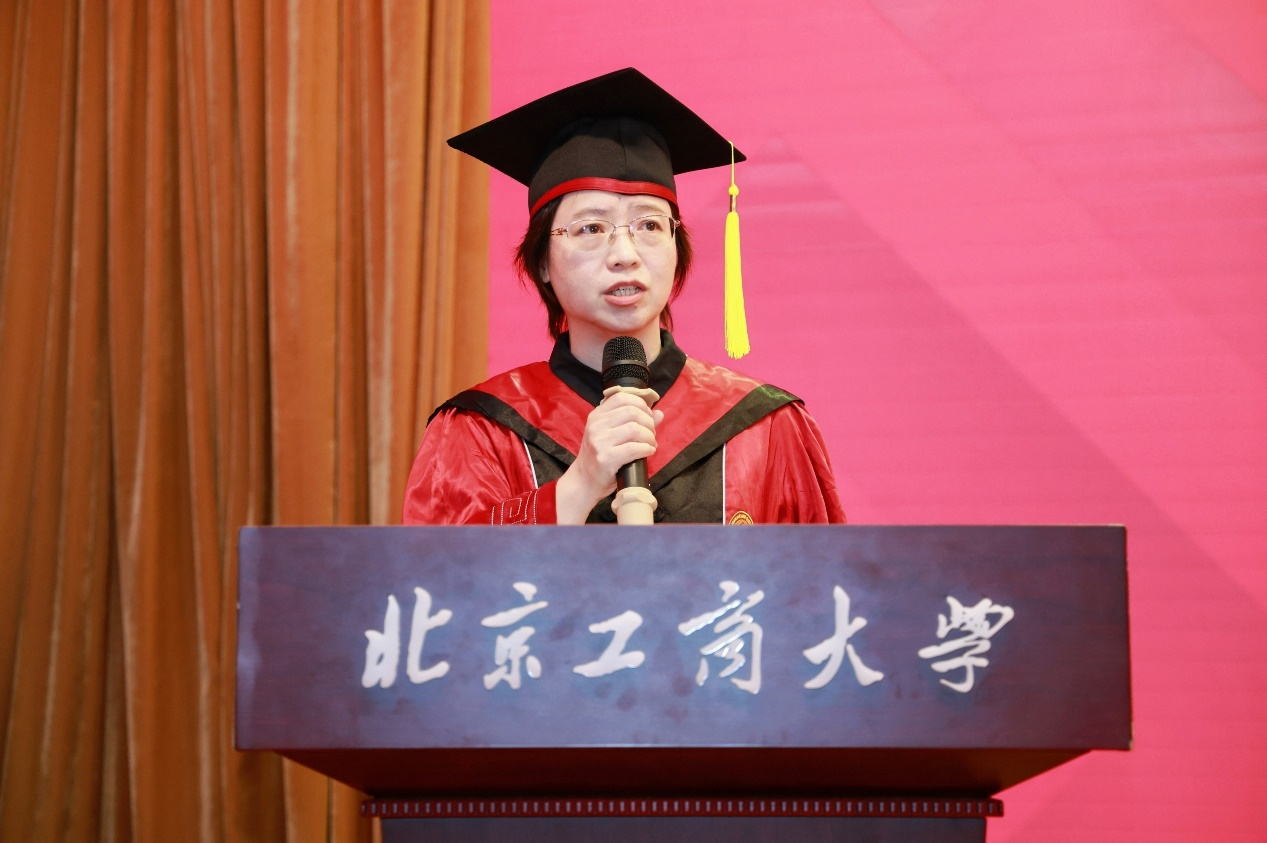 寇紅江代表學校向全體畢業生和畢業生家長表示最熱烈的祝賀和最美好的祝愿。他表示,過去的幾年里各位青年學子與學校一同成長,共同見證了學校的蒸蒸日上,同學們在學術探索上追求卓越,勇攀高峰;在社會服務中錘煉品格,磨礪意志;在團隊拼搏中學會合作,攜手成長;在逐漸成熟中感悟人生,學會感恩。同學們用自己的青春和熱情,為學校和學院注入了無限的活力,也為父母和家庭帶來了蓬勃的希望。寇紅江叮囑畢業生要不忘初心使命,在未來的道路上不斷實踐,成為國之棟梁。他告訴畢業生們,畢業不是結束而是新的起點,北京工商大學永遠是同學們的溫暖港灣和堅強后盾,歡迎常回家看看。