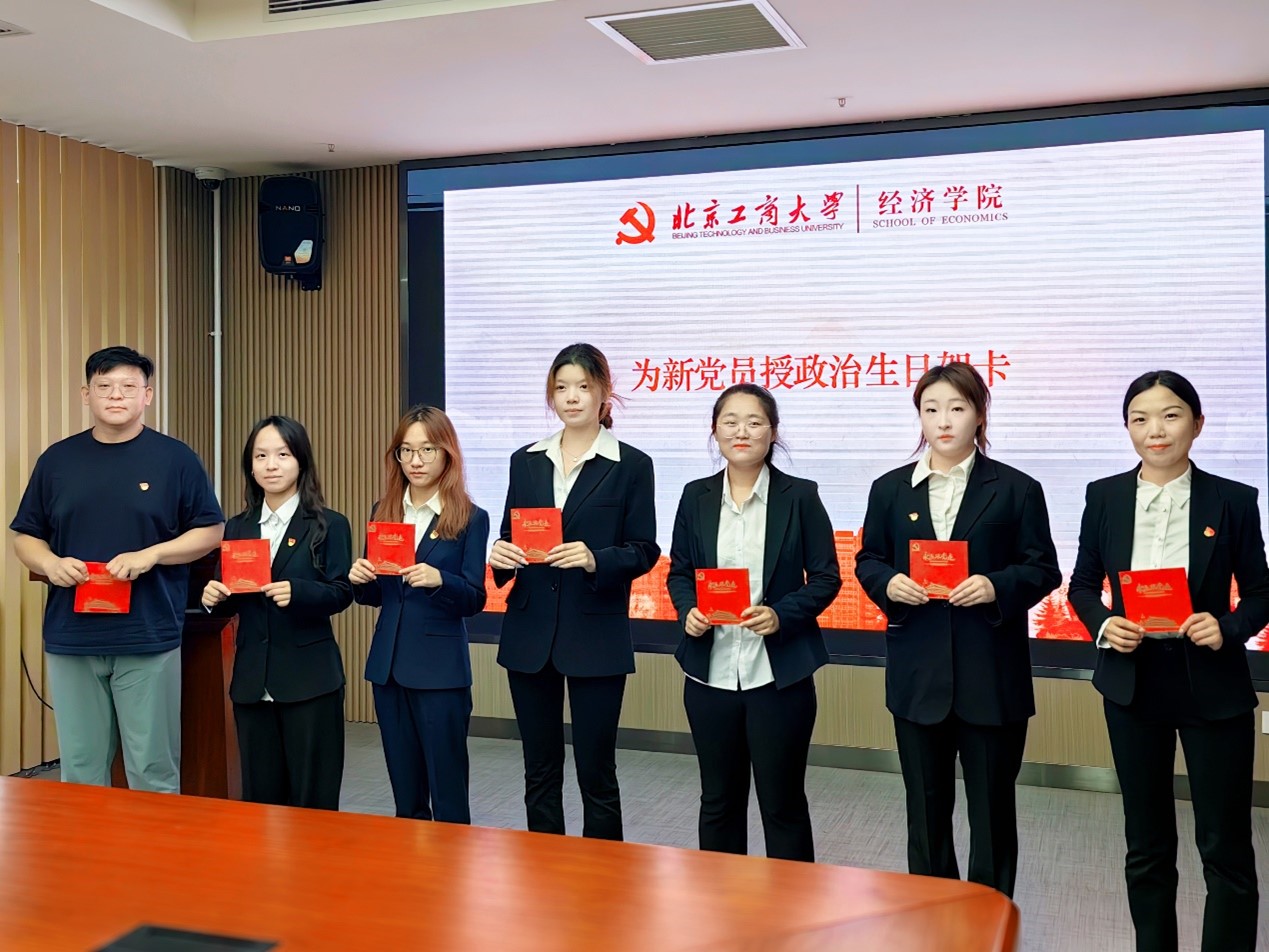 經(jīng)濟學(xué)院黨委副書記李艷春為新黨員代表授黨徽、黨章。