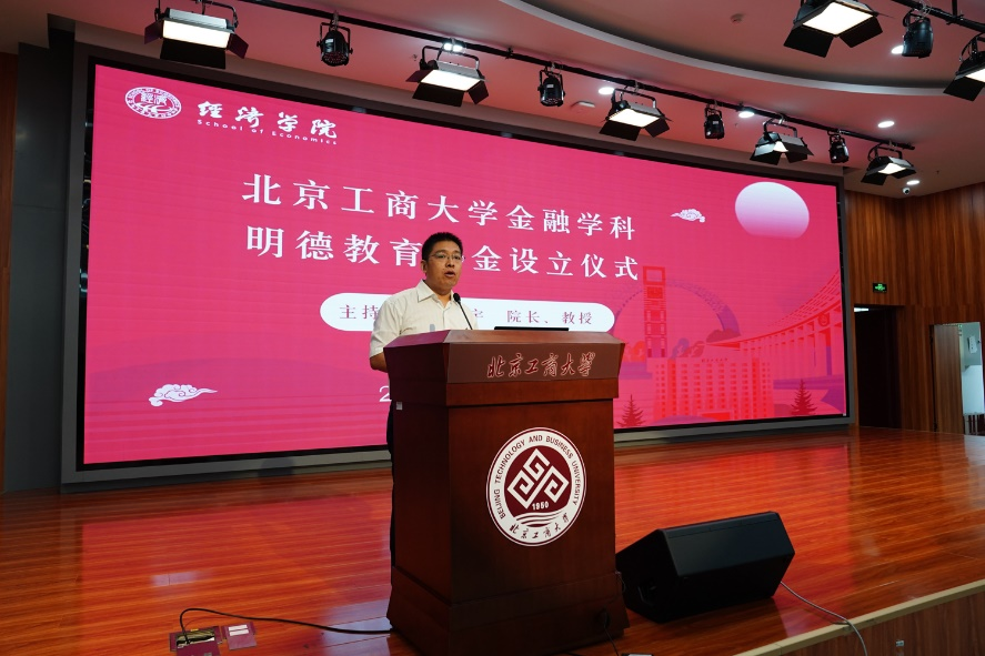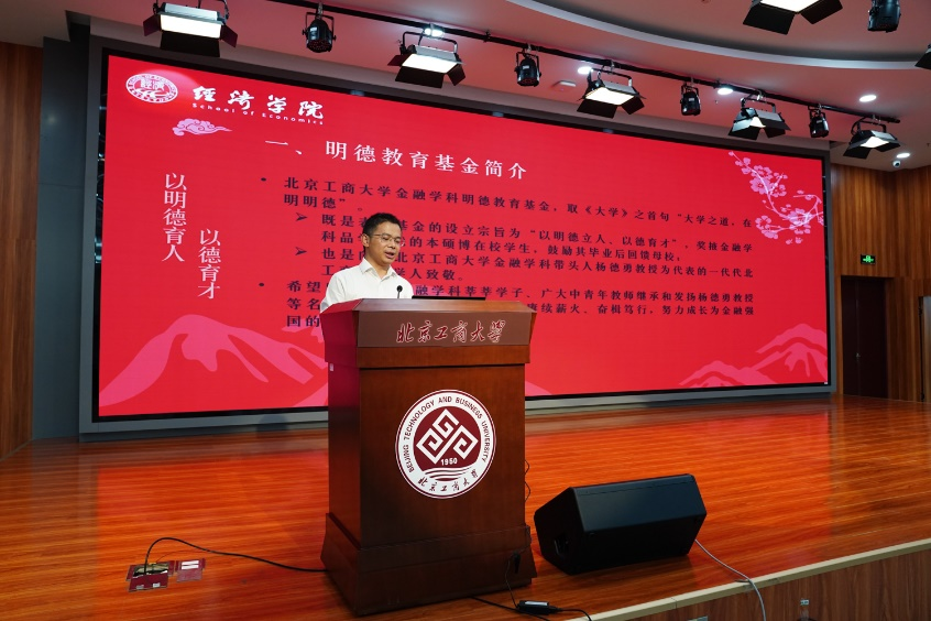 基金成立儀式由詹新宇教授主持。詹新宇介紹了北京工商大學金融學科明德教育基金名稱的由來與設立基金的整體設想。“明德”二字取自于《大學》之首句“大學之道,在明明德”,既是表明基金的設立宗旨為“以明德立人、以德育才”,也是向以北京工商大學金融學科帶頭人楊德勇教授為代表的北工商金融學人致敬。該基金將對金融學科未來的教學、科研和學生培養提供全方位的支持。詹院長回顧了北工商金融學科自1993年創建以來的發展歷程和所取得的系列成就,尤其是對金融學科帶頭人楊德勇教授從教四十年來的辛勤耕耘與豐碩成果表達敬意,并寄語金融學科,希望未來能夠賡續薪火,再譜華章。最后,詹院長宣布金融學科明德教育基金正式成立。