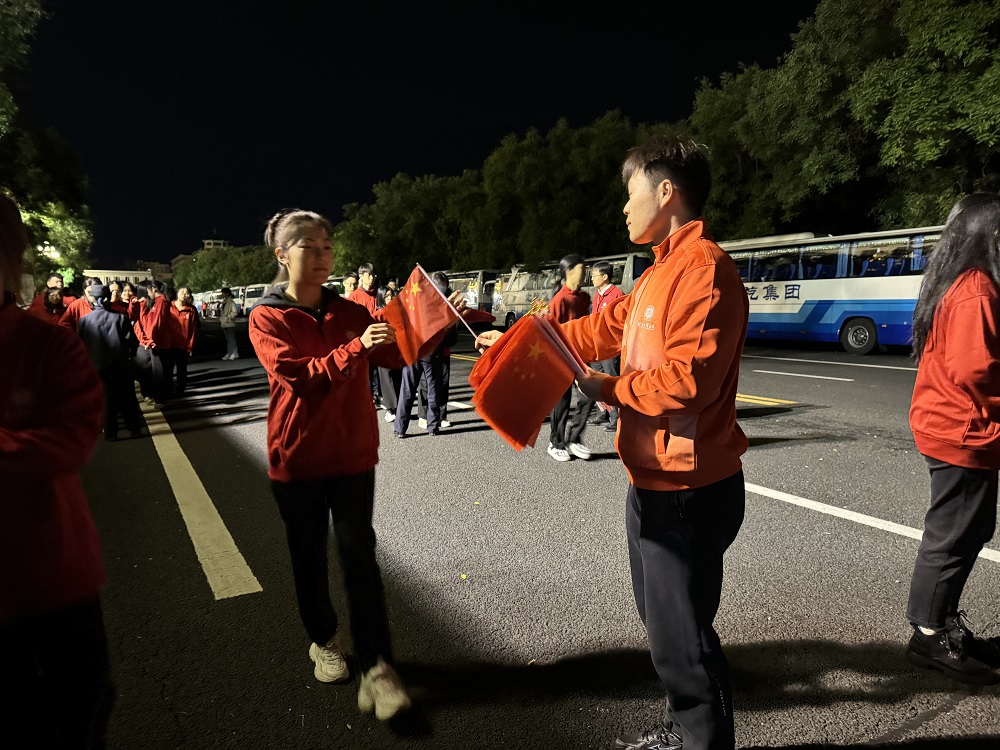 凌晨3點,一陣秋雨過后,陣陣涼意絲毫沒有減退師生們的熱情,興奮和激動溢于言表。大家乘車抵達天安門廣場,經(jīng)過安檢后,手持小國旗來到指定區(qū)域就位。