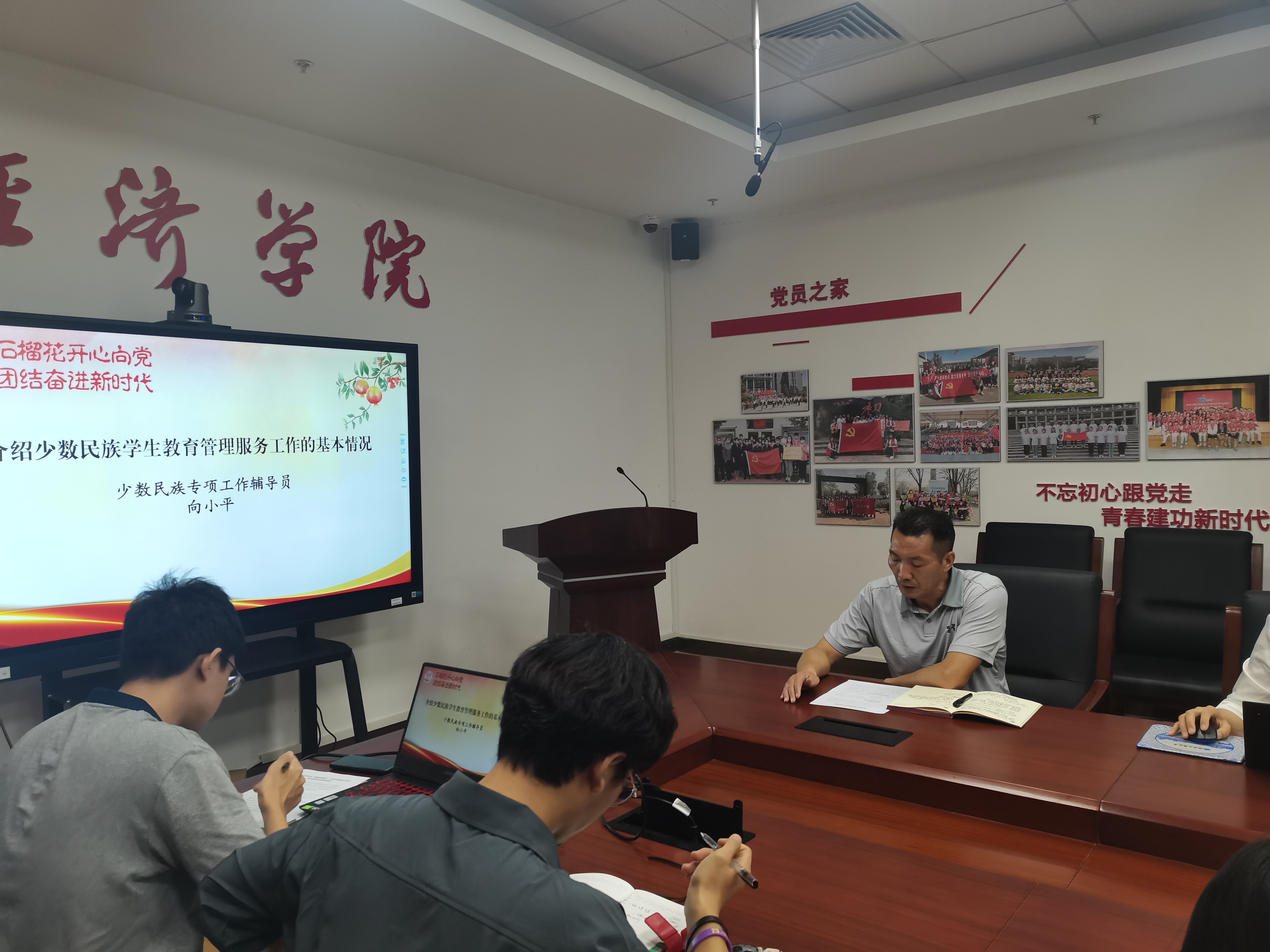 首先,少數民族專項工作輔導員向小平為在場師生介紹了學院少數民族學生教育管理服務工作的基本情況與工作特色。他提到,近幾年來學院緊緊圍繞“石榴花”為主題開展工作,先后開展“石榴籽”工程—新疆、西藏籍少數民族學生學業提升計劃、“民族之花遍地開,共抗疫情向未來”—少數民族學生座談會等活動,激發少數民族學生的學習積極性,加強他們對專業的了解以及認知度。當前,學院少數民族專項工作正與學生黨支部持續加強聯系,將政治理論好的黨員與少數民族同學結成“一幫一”聯系對子,幫助他們強化政治理論水平,從思想上、學習上、工作上進一步做好全方位提升。