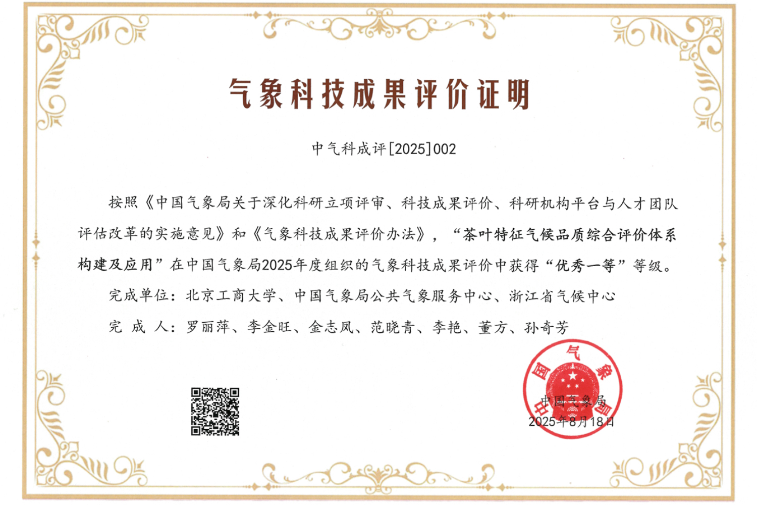 近日,中國氣象局公布2025年全國氣象科技成果評價(jià)結(jié)果,由我校食品與健康學(xué)院羅麗萍教授主持,依托中國氣象局與北京工商大學(xué)共建農(nóng)產(chǎn)品氣候品質(zhì)聯(lián)合研究中心,北京工商大學(xué)、中國氣象局公共氣象服務(wù)中心、浙江氣候中心共同完成的“茶葉特征氣候品質(zhì)綜合評價(jià)體系構(gòu)建及應(yīng)用”成果,憑借對農(nóng)產(chǎn)品氣候品質(zhì)研究的創(chuàng)新路徑與成果轉(zhuǎn)化國家級(jí)業(yè)務(wù)應(yīng)用,在眾多成果競爭中獲評“優(yōu)秀一等”,實(shí)現(xiàn)了我校在該領(lǐng)域的新突破。