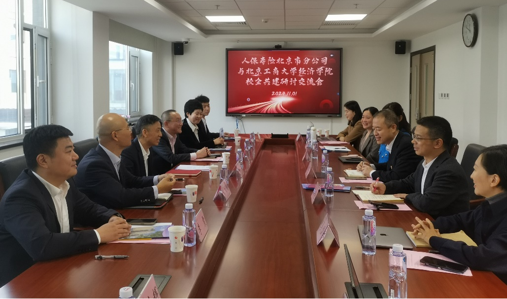 11月1日上午,中國人保壽險北京市分公司與北京工商大學經濟學院開展校企共建研討交流會議。人保壽險北京市分公司黨委書記兼總經理唐長勇、新軍發(fā)展部總經理王珺、人力資源兼組織部副部長鄭方明、豐臺支公司總經理李震、豐臺支公司副總經理殷愷澤等一行七人,經濟學院黨委書記呂良、執(zhí)行院長詹新宇、黨委副書記李艷春、副院長馬雪嬌,保險系教師代表徐徐、趙艷、宋占軍等參加座談。保險系主任徐徐教授主持座談會。