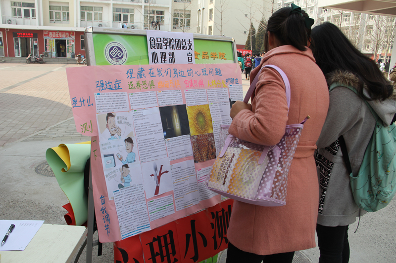 本次心理健康節(jié)以“開心見誠(chéng)——貴在知心”為主題,將埋藏在我們身邊的常見心理問(wèn)題一一列舉,活動(dòng)采用展板的方式進(jìn)行,并加以詳細(xì)注解和分析,使同學(xué)們對(duì)抑郁癥、人格分裂等心理問(wèn)題有了一個(gè)初步的了解。活動(dòng)現(xiàn)場(chǎng)同學(xué)們通過(guò)心理健康測(cè)試并結(jié)合展板上的內(nèi)容,來(lái)初步判斷自己的心理健康狀況,心理部成員就大家的測(cè)試情況給出相應(yīng)的心理輔助措施。