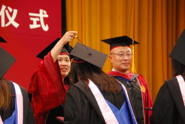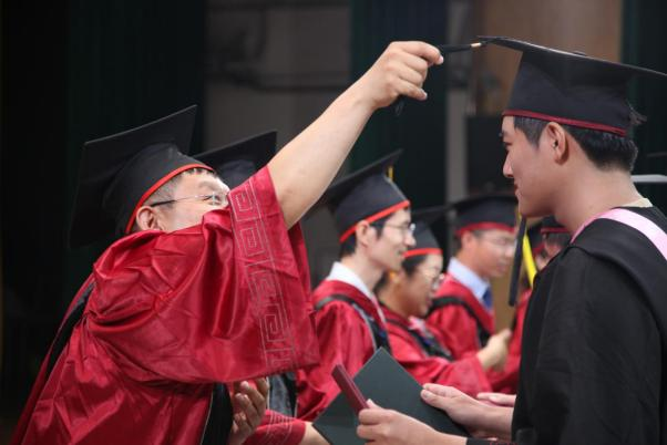 在2023屆本科畢業(yè)生學位授予儀式環(huán)節(jié),學院學位委員會成員張春萍、毛新述、張倩、孫永波、張偉華、鄧春平、彭紅星、張晨宇、王勇及導師代表朱蓉共同為全體本科畢業(yè)生撥蘇正冠并頒發(fā)學位證、畢業(yè)證。正冠撥穗,商舟揚帆,領航未來。