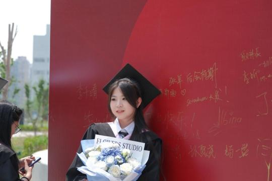 商學院在二期新學活廣場上設置了簽名留言展板,畢業(yè)生們手握金色簽字筆,紛紛在展板上留下自己的姓名和對彼此的祝福,手捧鮮花,留下最美的青春印記!