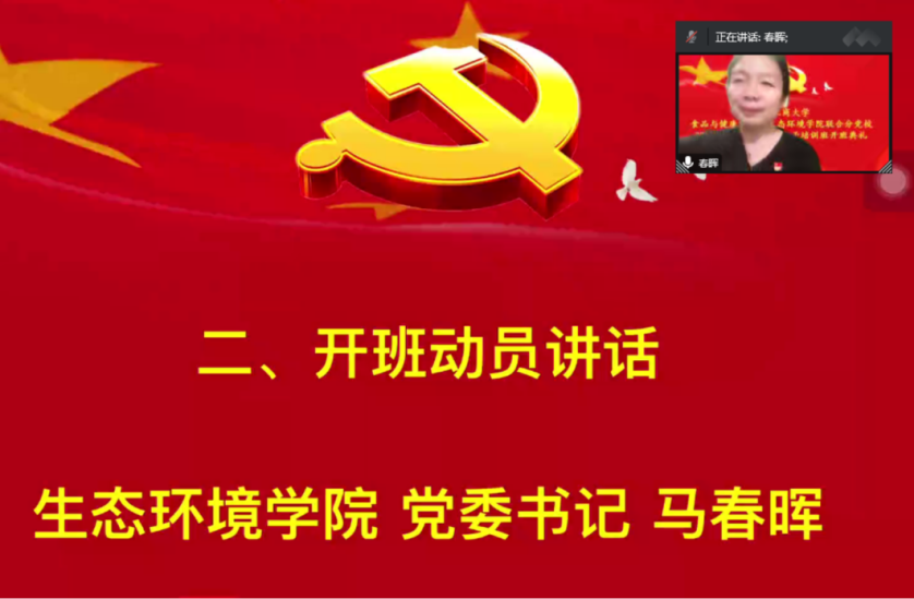 為進一步加強對入黨積極分子的培養、教育和考察,提高入黨積極分子的政治素養和理論水平,保證黨員發展質量,12月2日,食品與健康學院、生態環境學院聯合分黨校以線上的形式舉行了2022年秋季入黨積極分子培訓班開班典禮。食品與健康學院黨委書記胡燕霞、生態環境學院黨委書記馬春暉出席了開班典禮,專職組織員李璐、李娜,黨校兼職輔導員以及133名入黨積極分子參加了開班典禮。