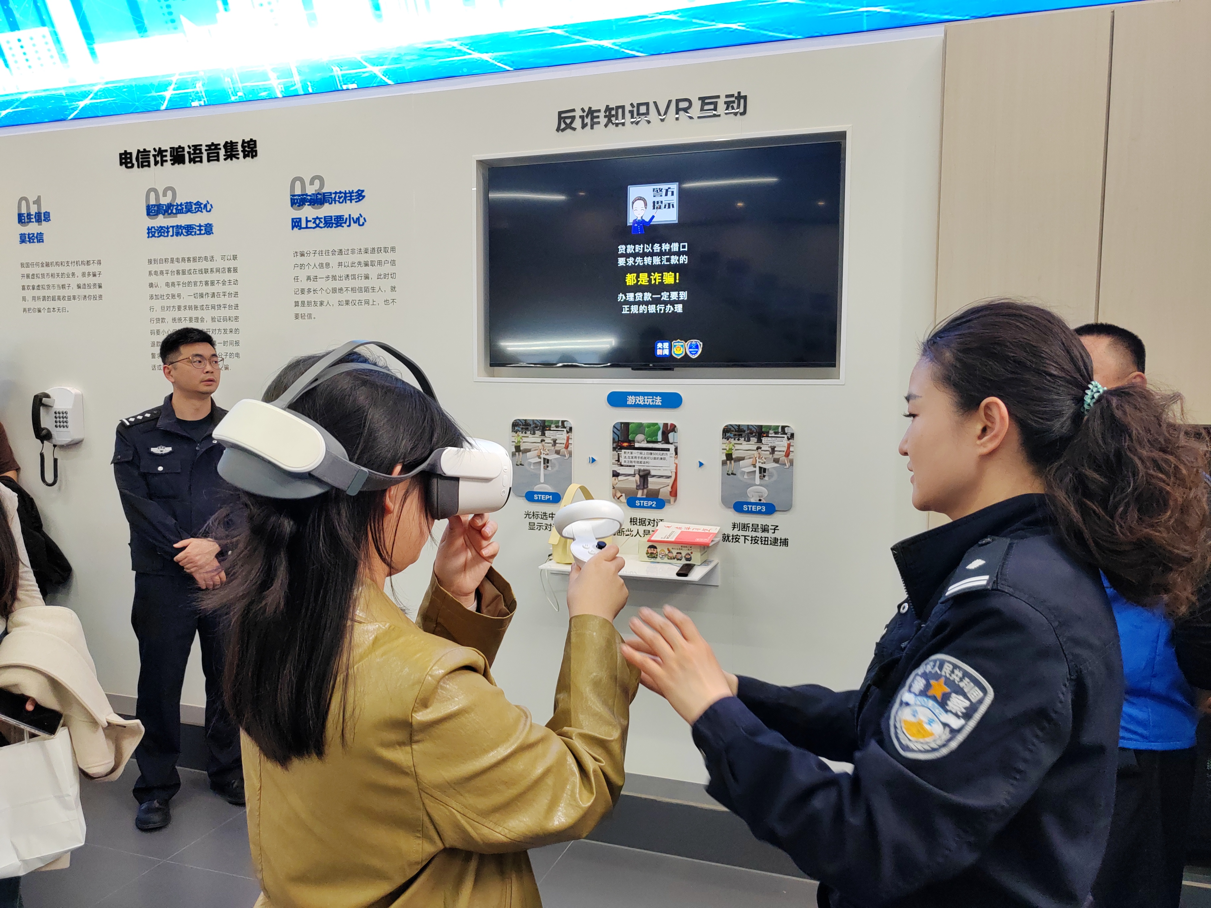 樊蕾警官帶領(lǐng)同學(xué)們體驗(yàn)VR辨詐騙虛擬現(xiàn)實(shí)互動(dòng)游戲,帶上VR眼鏡“犯罪嫌疑人”就出現(xiàn)在體驗(yàn)者周?chē)?,體驗(yàn)者通過(guò)分辨與虛擬人物的對(duì)話來(lái)判定是否為詐騙行為,現(xiàn)場(chǎng)判斷現(xiàn)場(chǎng)逮捕,趣味性強(qiáng)、互動(dòng)性高。大家通過(guò)對(duì)虛擬場(chǎng)景中詐騙話術(shù)的辨別和沉浸式體驗(yàn)“抓捕”,提高了對(duì)反詐騙知識(shí)的了解和認(rèn)識(shí),有效提升了對(duì)詐騙話術(shù)的識(shí)別能力。
