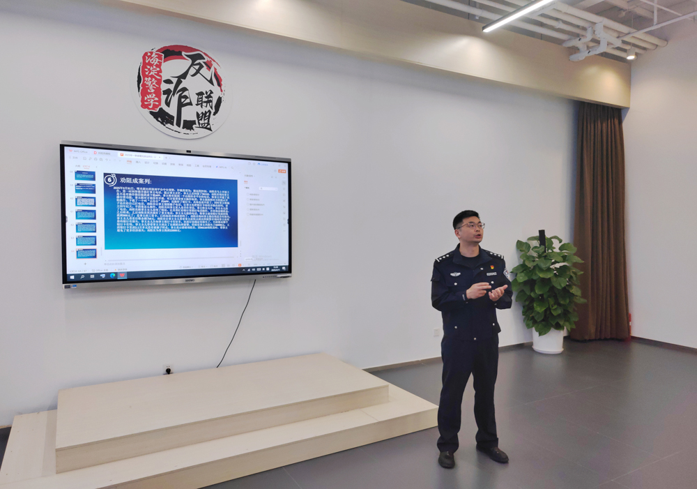 海淀公安分局高校內(nèi)保支隊(duì)民警陸澤山、曙光派出所反詐預(yù)警勸阻專(zhuān)員李鵬以“詐騙類(lèi)型與話術(shù)識(shí)別”為主題,為同學(xué)們講述反詐知識(shí)“第一課”。通過(guò)民警講述,同學(xué)們了更加直觀地了解了“刷單返利”“虛假投資”等常見(jiàn)詐騙類(lèi)型,并通過(guò)下載安裝國(guó)家反詐中心APP主動(dòng)學(xué)習(xí)反詐技巧。之后,研究生們?cè)诿窬瘞ьI(lǐng)下參觀了調(diào)解勸阻室、警民照片墻等場(chǎng)所,其中“詐騙話術(shù)創(chuàng)意海報(bào)”以詼諧幽默的方式形象揭示詐騙套路,引發(fā)大家駐足觀看并深度討論。
