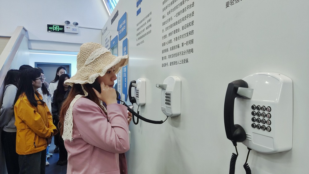 講解員介紹了現(xiàn)場(chǎng)裝置的詐騙語(yǔ)音集錦墻,同學(xué)們拿起電話,“客服退款”“中獎(jiǎng)通知”等詐騙話術(shù)便在耳邊響起,真實(shí)模擬詐騙電話的接聽(tīng)場(chǎng)景,創(chuàng)意的設(shè)計(jì)和沉浸式場(chǎng)景還原讓大家有身臨其境的感覺(jué)。