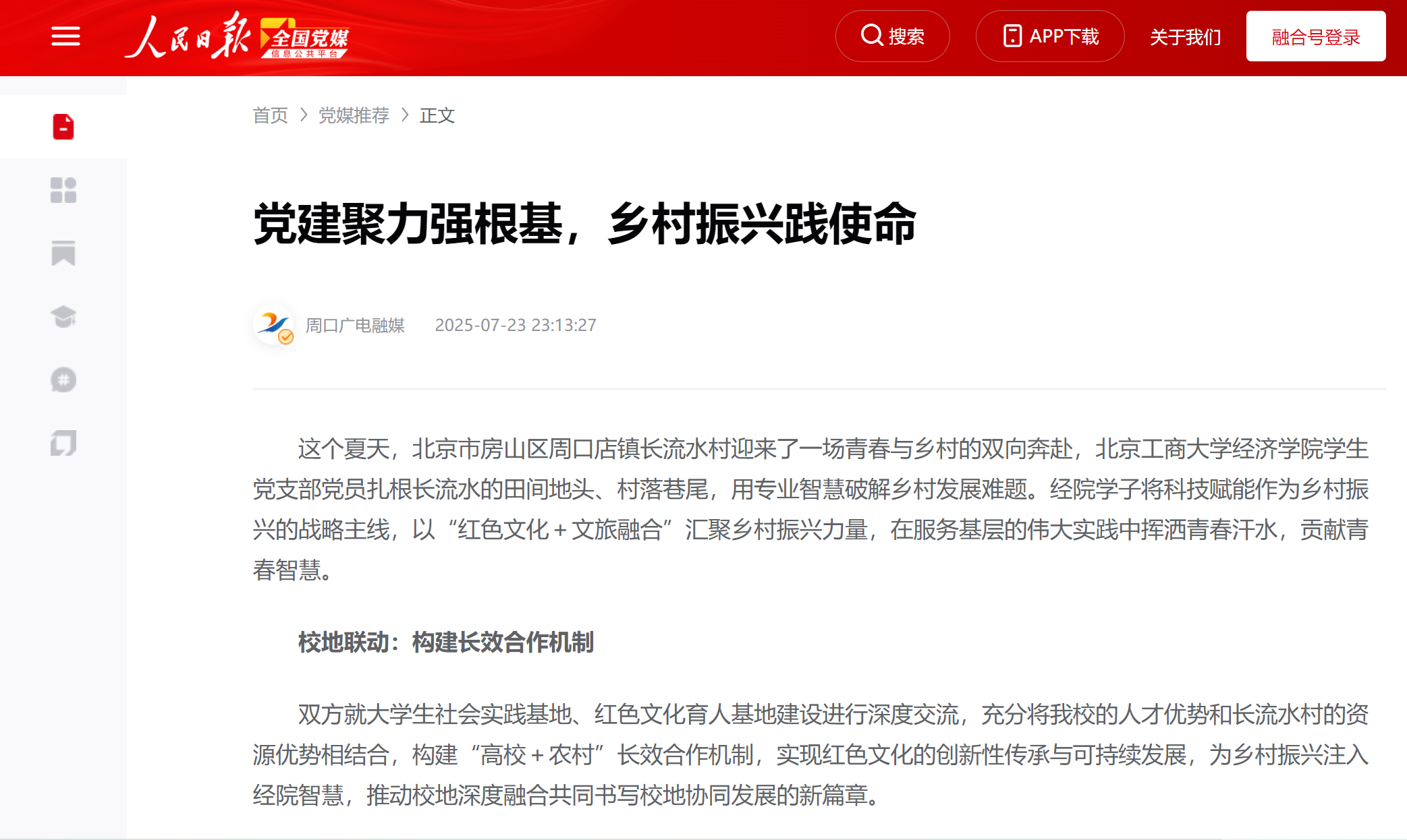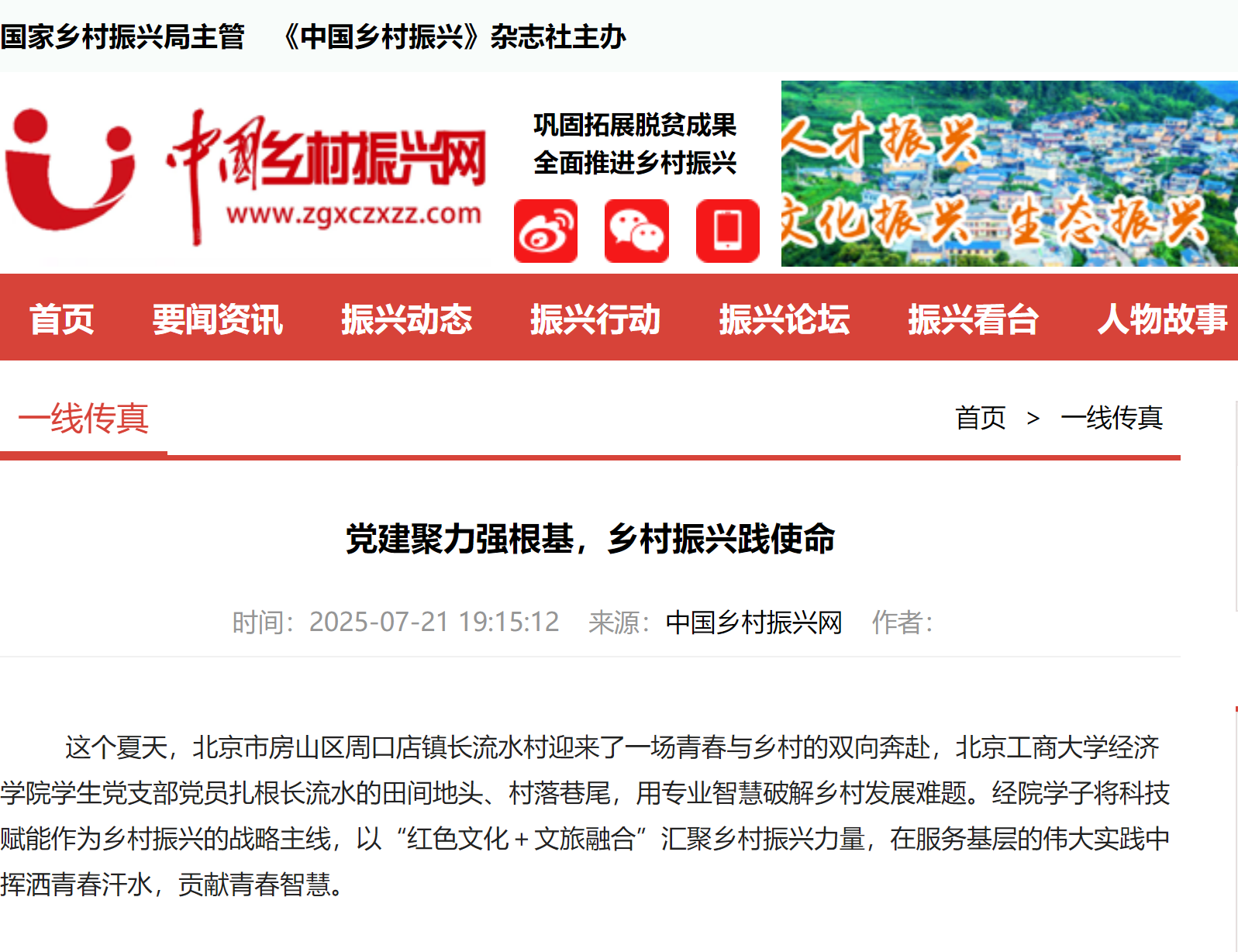 近日,學習強國、中國鄉村振興網、中國日報網等多家媒體以《黨建聚力強根基,鄉村振興踐使命》為題,報道北京工商大學經濟學院紅色“1+1”學生黨支部實踐活動。