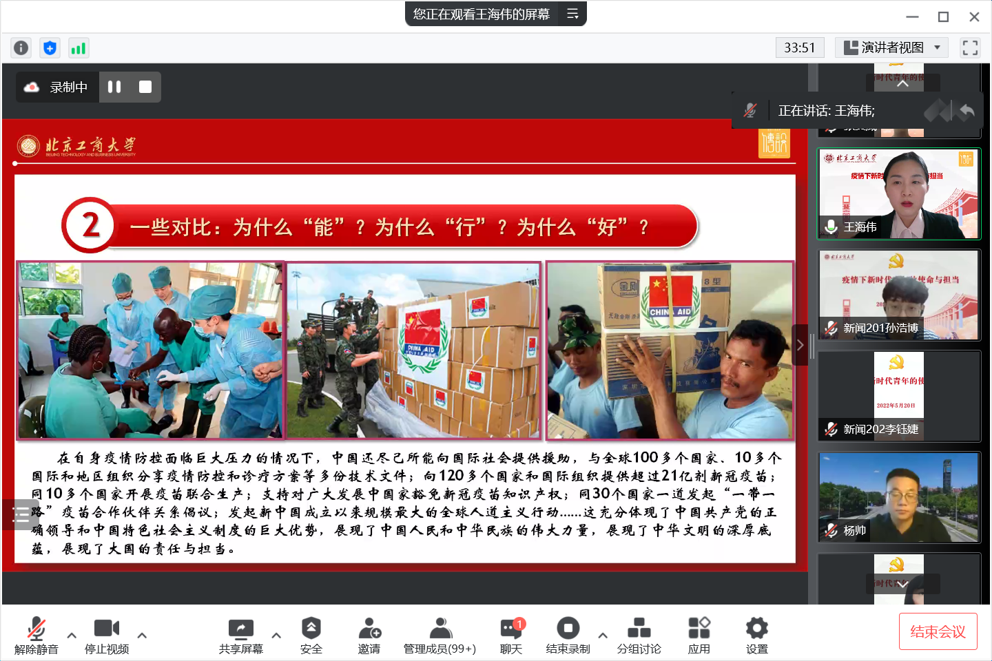 王海偉以《疫情下新時(shí)代青年的使命與擔(dān)當(dāng)》為題,從目前疫情防控整體形勢分析出發(fā),圍繞疫情防控中的一些記憶、對比、啟示與思考等四個(gè)方面講授。她表示新冠病毒疫情防控攻堅(jiān)戰(zhàn)是一場現(xiàn)實(shí)的思政課,一堂鮮活深刻的思政課,也是一堂難忘的思政課。她帶領(lǐng)師生共同回顧了疫情防控以來學(xué)院師生主動(dòng)投身校內(nèi)外抗擊疫情的生動(dòng)事跡,充分彰顯了學(xué)院師生黨員的責(zé)任與擔(dān)當(dāng)。提醒師生居家學(xué)習(xí)工作期間保護(hù)好自己和家人,呼吁師生們要堅(jiān)定信心,自覺在思想上、政治上、行動(dòng)上與黨中央保持高度一致。通過與國外抗疫數(shù)據(jù)對比,指出我國動(dòng)態(tài)清零的疫情防控政策,最大限度的保護(hù)了人民群眾人身財(cái)產(chǎn)安全,是人民至上,生命至上的最好詮釋,體現(xiàn)了黨始終把為中國人民謀幸福,為中華民族謀復(fù)興作為自己的初心使命,充分彰顯了黨領(lǐng)導(dǎo)的政治優(yōu)勢和中國特色社會(huì)主義制度的顯著優(yōu)勢。