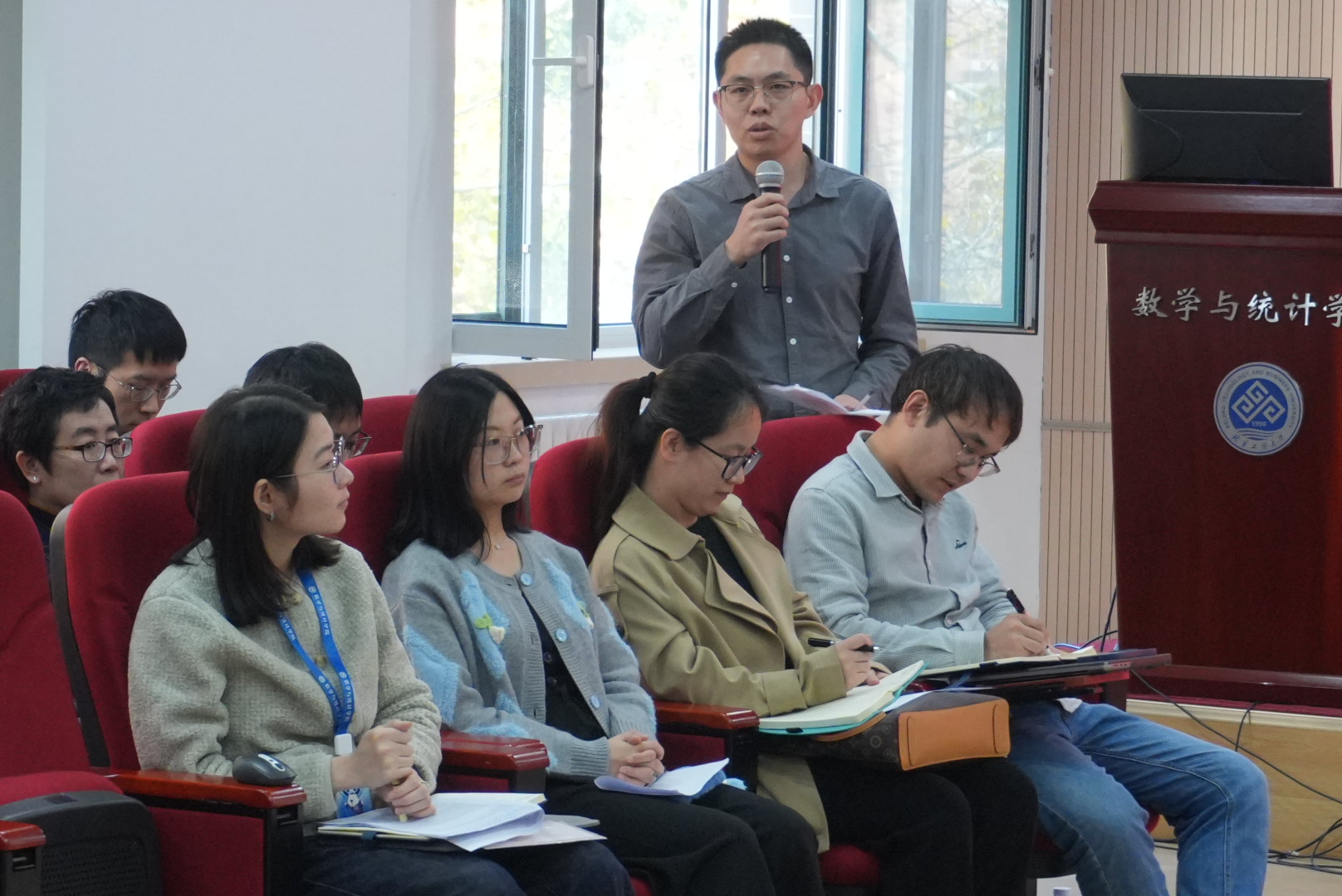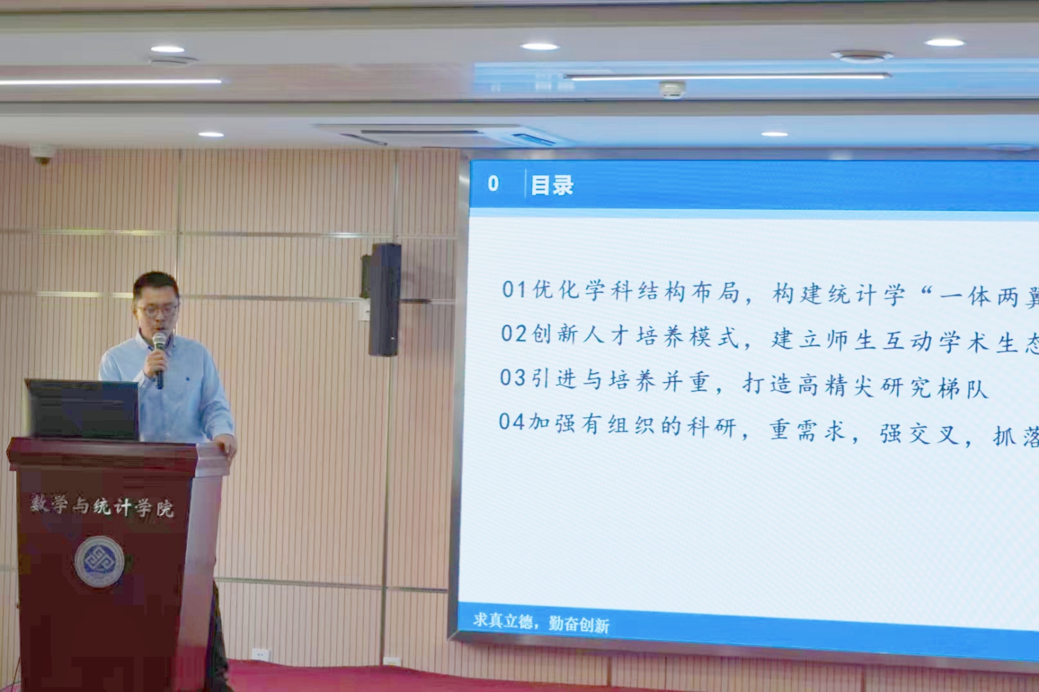 數(shù)學(xué)與統(tǒng)計(jì)學(xué)院副院長王康以“錨定一流學(xué)科,突出交叉特色,明晰戰(zhàn)略定位”為主題,圍繞學(xué)科布局、人才培養(yǎng)、研究梯隊(duì)和科研發(fā)展四個方面進(jìn)行專題匯報(bào)。應(yīng)用統(tǒng)計(jì)系主任謝峰、數(shù)據(jù)科學(xué)系主任岳美玲、經(jīng)濟(jì)統(tǒng)計(jì)系主任趙江分別就各系的基本情況、研究方向和未來規(guī)劃進(jìn)行了匯報(bào)交流。