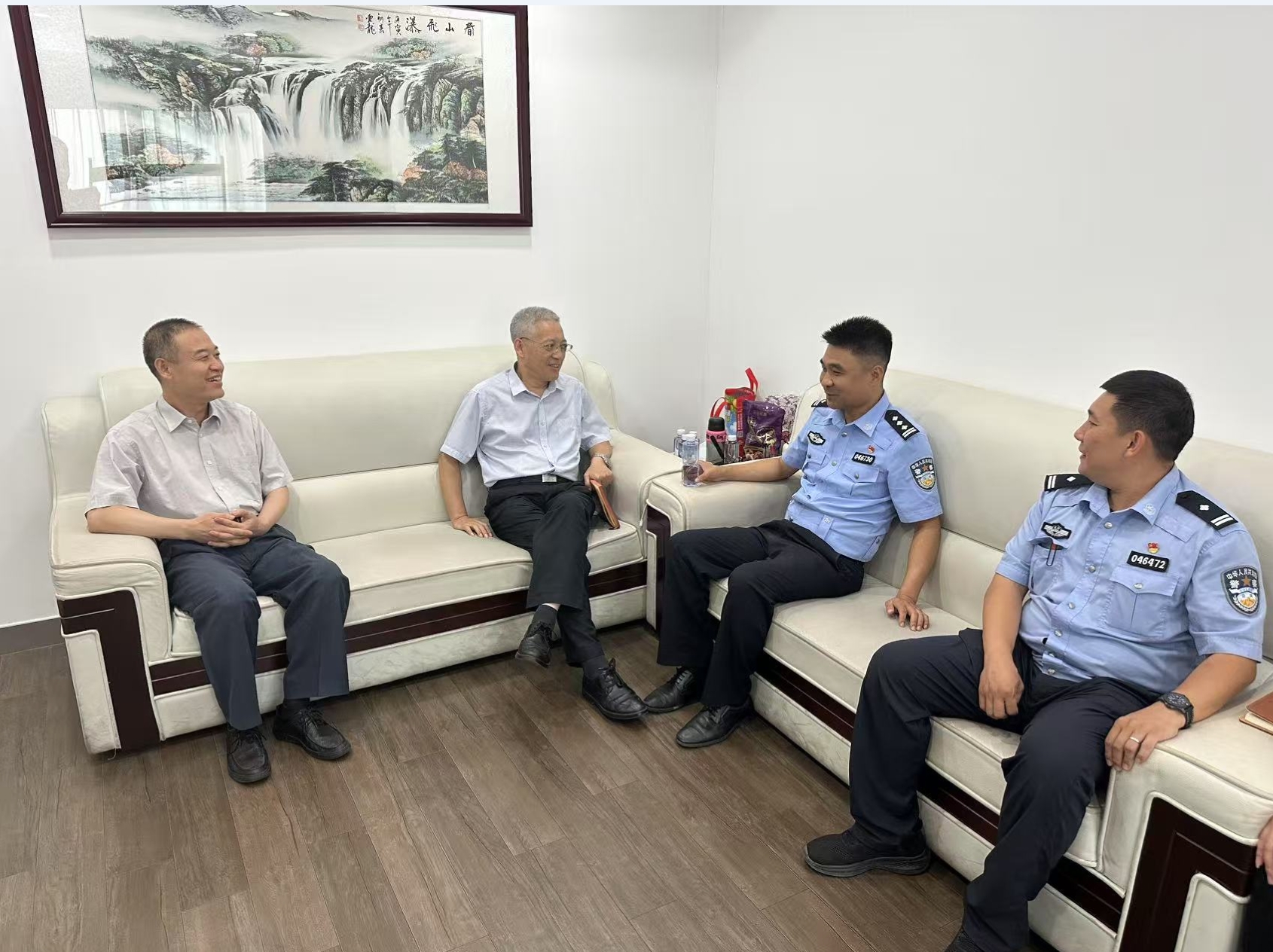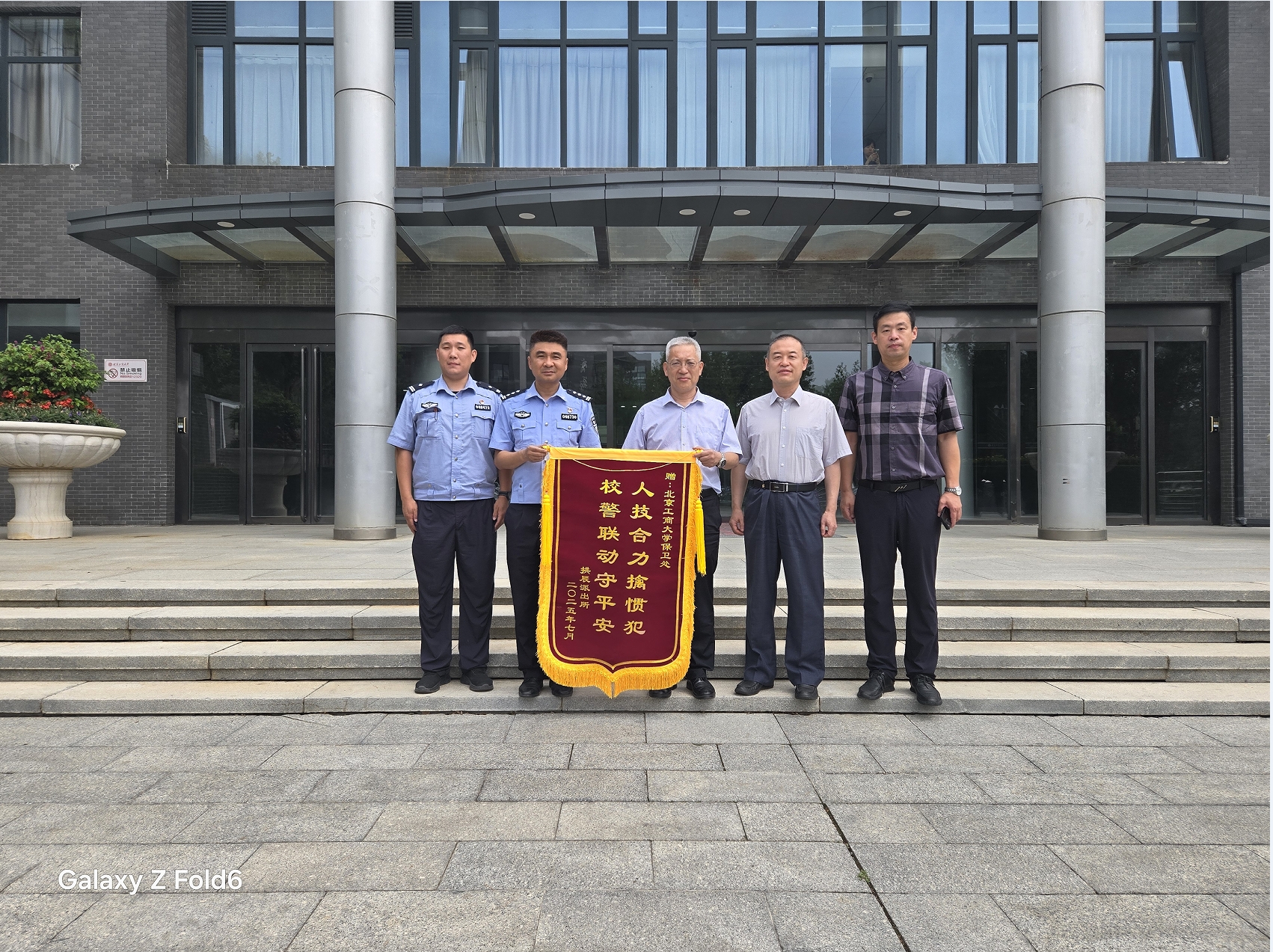 7月9日,拱辰派出所朱峰所長、李冉副所長專程來校慰問交流。學校黨委副書記李中奇代表學校,鄭重接受了派出所贈送的錦旗。近年來,通過校警聯盟協同工作機制的持續深化,雙方在戶籍服務、治安管理及預防電信網絡詐騙等領域強化合作,良鄉校區整體治安環境穩步提升,校園秩序持續向好。
